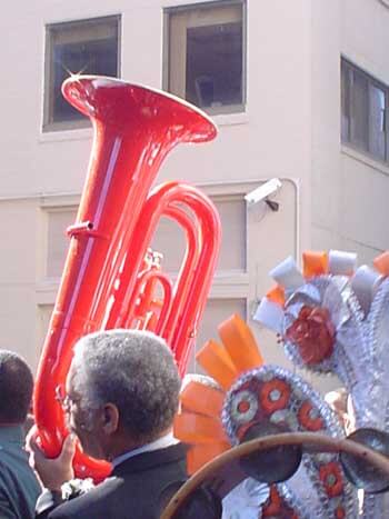 Tuba Fats' greatest legacy was not the sound of his horn playing for tips or on parade, but the way he shared his love of music, his ever-changing ensemble and his positive attitude with tourists, natives and musicians alike. So it was that players from the great brass bands were there for the funeral parade: Tremé, Rebirth, Dirty Dozen, and many others. A line of tubas, a man with a red tuba, all the celebrants filled with sorrow, but also exalting Tuba Fats with signs and pictures, in fine suits and fancy dresses, hot colors and cool hairdos. They were alternately somber or cheered as the mood of the music changed: slow dirge, medium hymn, fast march. Probably 2,500 made their way with the horse drawn casket to the French Quarter, down Bourbon Street — a rare honor due to Tuba's daily play on Jackson Square — where tourists gawked and clamored. A somber stop at St. Louis Cathedral, where a priest blessed the bier while those who knew Tuba Fats cried out his goodness. Starting up and out of the Quarter the several blocks long throng sang "Down By the Riverside" with the line "Ain't gonna study war no more" resonating about life here and abroad.