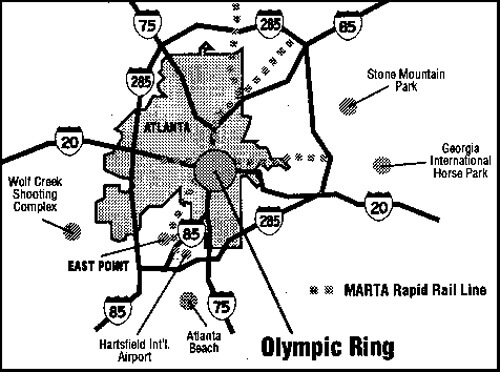 "The world of journalists descending on Atlanta for the Olympics will find it particularly difficult to ignore this poverty because so much of it is concentrated in and around what is known as the Olympic Ring - a three-mile wide circular area in Atlanta's downtown core which contains nine major venues holding sixteen of the thirty sporting events. According to data collected in 1990, ninety-two percent of the 52,000 people living in the Olympic Ring neighborhoods are African-American, and most of them are poor. The median household income in these neighborhoods is just $8,621, the median per-capita income is $5,702, and labor participation rates are no higher than seventy percent and as low as thirty-five percent. Does ACOG expect journalists not to address this obvious poverty in their descriptions of the city? As Reverend Austin Ford, who works in the neighborhood surrounding the new Olympic stadium, puts it, 'The Olympic stadium is in a very depressed community, and I don't know that the journalists will need for that to be pointed out to them. They might say, 'Well, I can see!'"15http://reagan.library.emory.edu/alice/schanges/article.php?id=sc18-2_002
