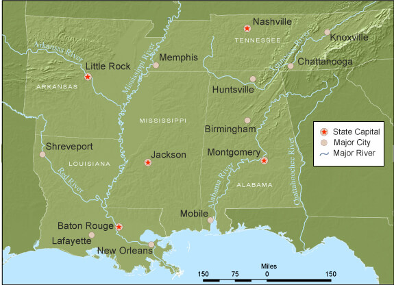 Since coming to Mississippi in 1999, most of my photographic energies have gone into making images of the social and cultural landscapes of the rural and small-town South. During the spring and summer of 2004, however, I took a break from those kinds of places and photographed in some of the larger cities. For practical reasons, I limited myself to the states of the "mid-South:" Alabama, Arkansas, Louisiana, Mississippi, and Tennessee. I decided to photograph in all of the cities in those states that the 2000 census listed as having populations of 100,000 or more. There were fourteen: Birmingham, Huntsville, Mobile, and Montgomery in Alabama; Little Rock in Arkansas; Baton Rouge, Lafayette, New Orleans, and Shreveport in Louisiana; Jackson in Mississippi; and Chattanooga, Knoxville, Memphis, and Nashville in Tennessee.