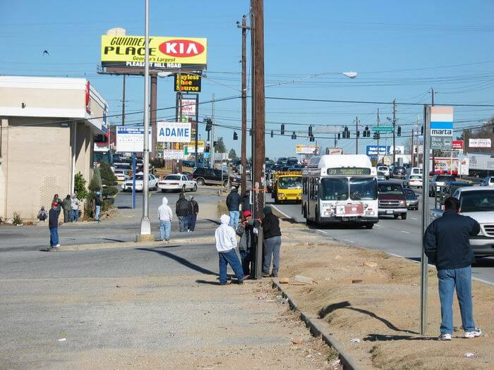Until the early 1990s, most labor pools and catch-out corners were in Atlanta's urban core, especially near Techwood Street, the "center of the universe for homeless and unemployed people who were looking for work."14Williams, Hard Labor, 12. As the construction of homes, offices, and shopping centers increased in the suburbs, several labor pools moved from downtown Atlanta to suburban locations. Local upstart labor pools (or branches of regional or national chains) moved there as well. These labor pools were closer to the rising number of Latino day laborers who were settling in suburban regions in large numbers in the 1990s. Several urban labor pools also remained in Atlanta's central business district where homeless shelters and "cat holes" (makeshift sleeping arrangements in parks, under highways, and in patches of forest) continued to provide workers for the day labor marketplace (See Preston Quesenberry, "The Disposable Olympics Meets the City of Hype").