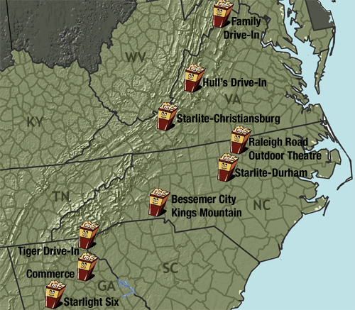 The drive-in theaters featured in this essay are located in the Valley of Virginia, the Appalachian foothills, and the eastern edge of the North Carolina piedmont. Each suggests how people in different rural and urban places relate to the drive-in: from the bustling Starlight Six in Atlanta to the defunct Starlite in Durham; the rebirth of the Tiger Drive-in and the all-but-disappeared Commerce Drive-In in northern Georgia.