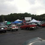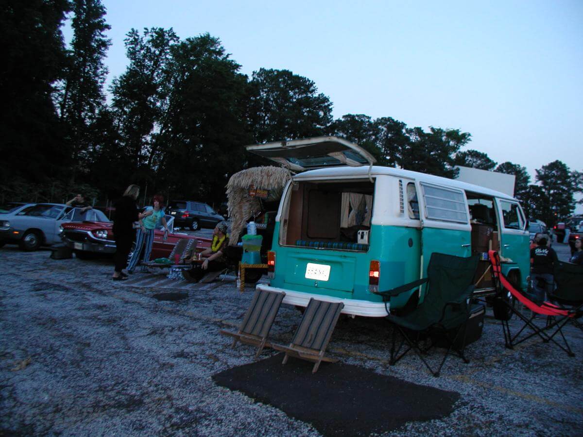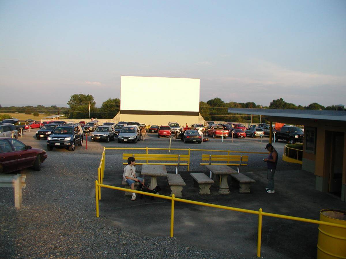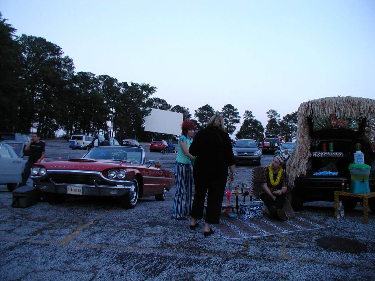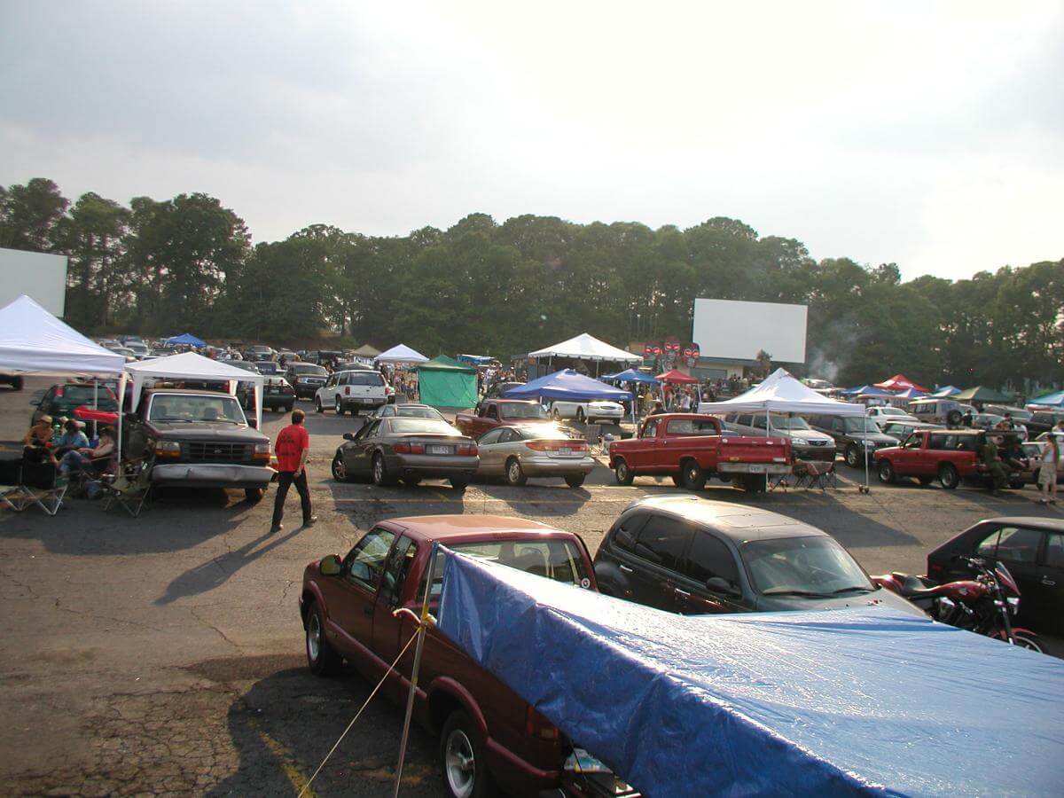 On hazy weekend evenings in the Atlanta summer, groups of twenty- and thirty-somethings gather around portable grills and mingle with carloads of young families, middle-aged couples, retirees, and teenagers. Just before the double-feature starts around nine o’clock, lines to the indoor restrooms stretch past the snack bar and visitors trot to the concession counter for nachos, fountain drinks, hotdogs, and large bags of popcorn. Many patrons tune their car radios to their screen's FM channel and roll their windows down to hear the car speakers as they sit in folding chairs in front of their vehicles. Clunky portable radios and ancient boomboxes sometimes stand in the middle of clustered viewers. As the main feature plays, theater attendants in golf carts survey the lot, often illuminated by the headlights of latecomers searching for open spaces. Headlights flit around the lot, then fade as the credits roll.
