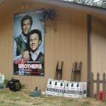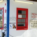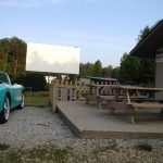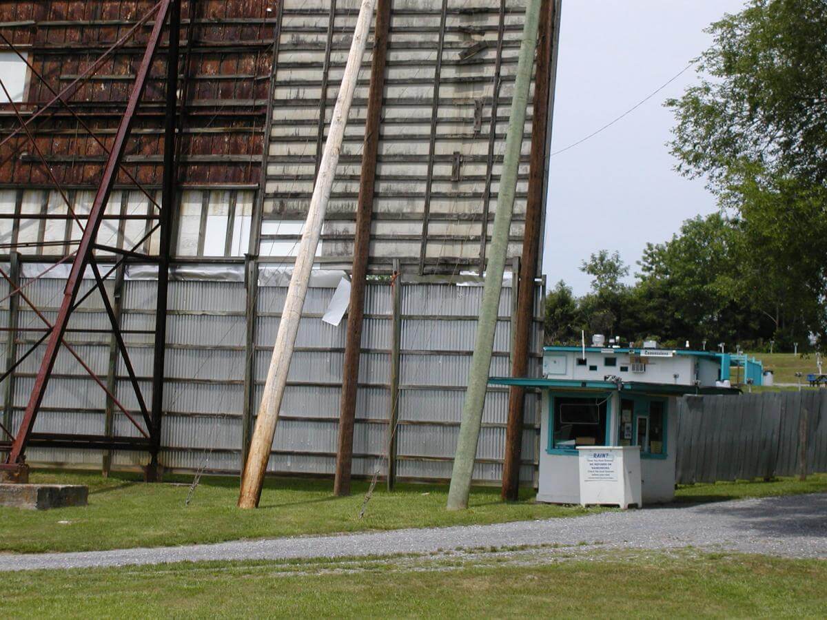 Small and well-kept, Hull's Drive-In Theater is nestled in the rolling hills along US Route 11, just north of Lexington, Virginia. Vintage speakers decorate the gravel parking lot and mark parking spots for patrons. The speakers are functional, but audio is also transmitted by the theater's FM broadcast. Bright blue restaurant tables adjoin the concession stand. A black-and-white flyer near the snack counter promotes the 75th Anniversary of Drive-Ins by offering seventy-five cent popcorn. Hull's large, white movie screen is supported by metal framework in the middle and by wooden telephone poles on the sides, which suggests that the screen may have been enlarged at some point in the past.
