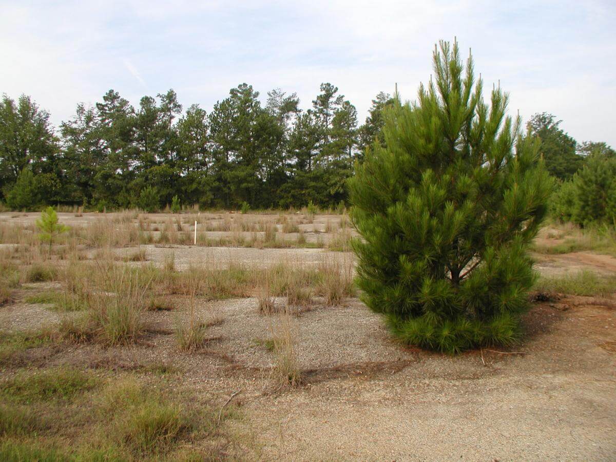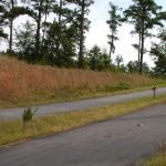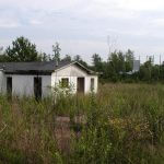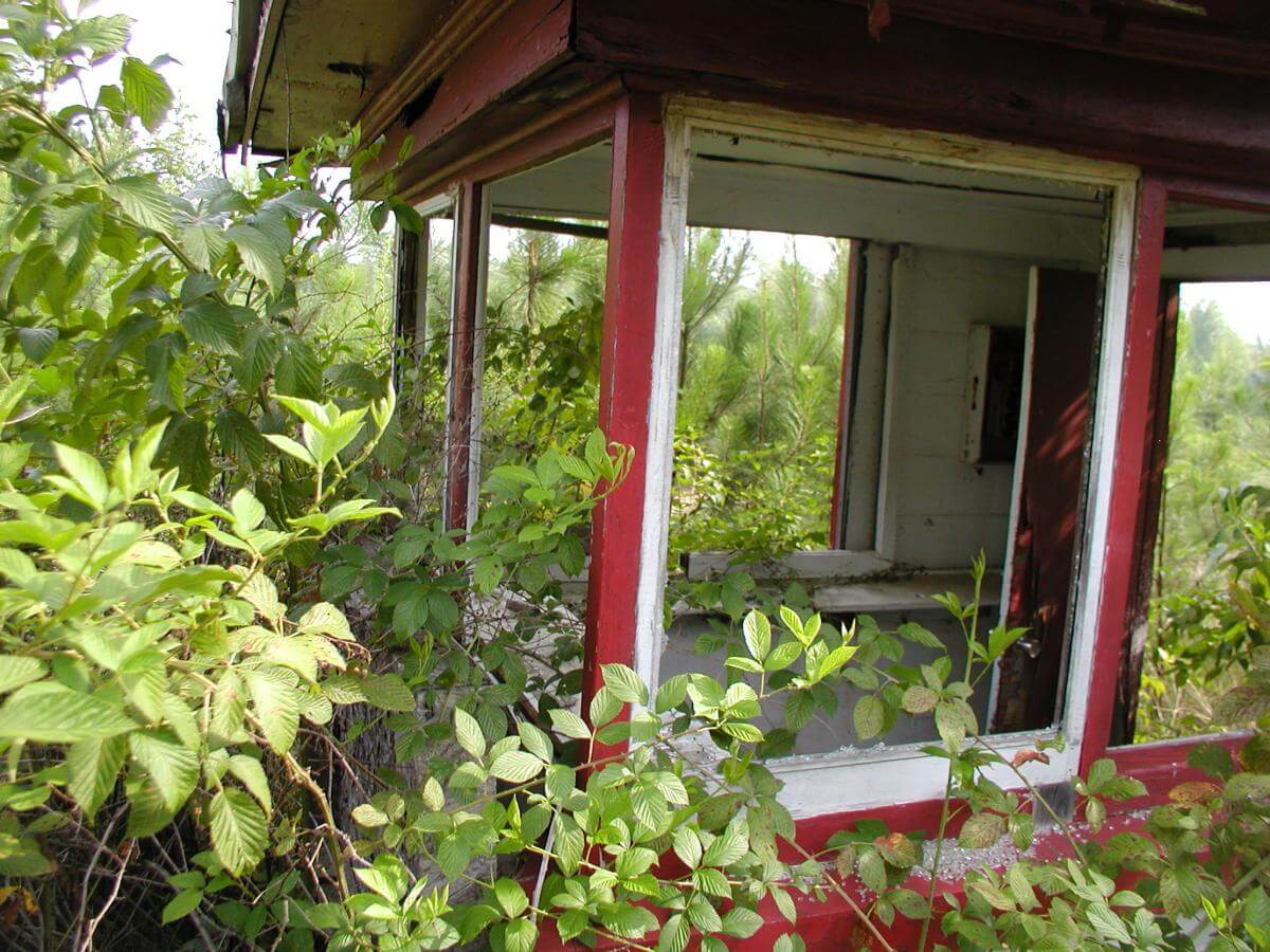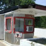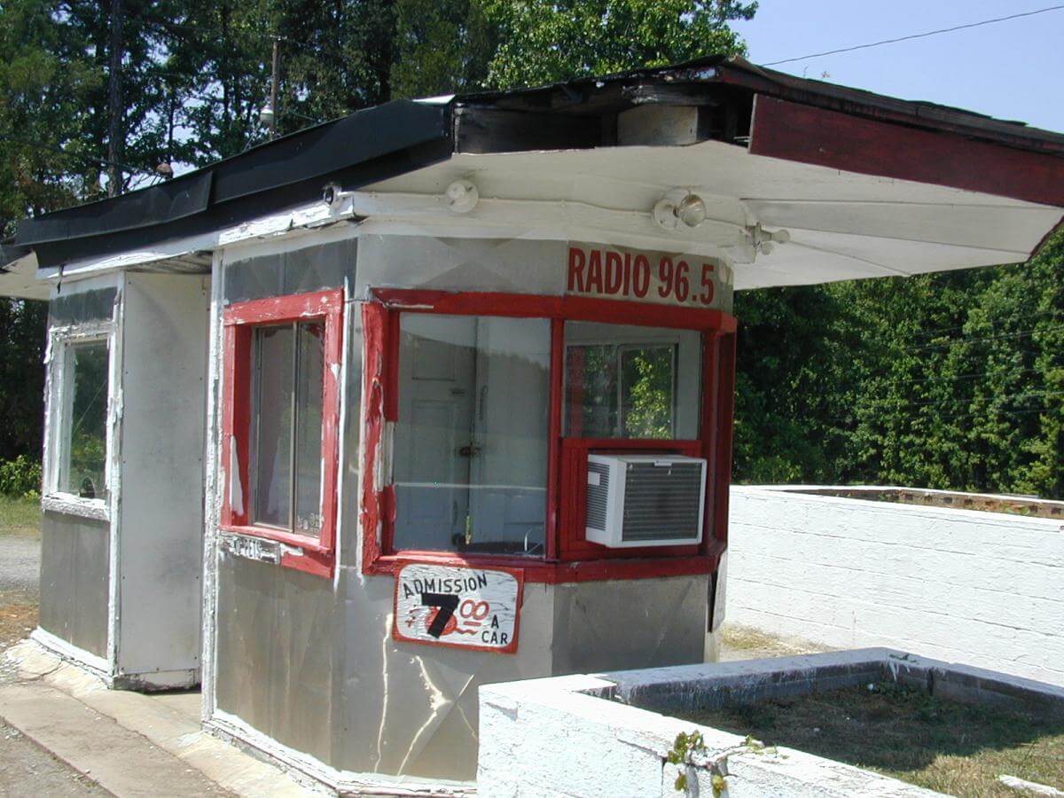 Two parallel driveways leading away from US Highway 441, just south of Commerce, Georgia, offer the only indication that the Commerce Drive-In once stood over the crest of the hill. A "for sale" sign stands on a rise to the left; a cable stretched across the entrance bars entry Paved asphalt and cropped grass give way to an undergrowth of tall weeds, briars, and young pines. Broken pavement covered with pine straw and weeds curves around the ticket booth. The booth's white paint appears crisp, but the red trim is peeling, and no glass remains in the windows. Vines, thorns, and large bushes block approach to the booth on three sides. Beyond, the brush clears to reveal the old parking lot, concession stand, and, at the far edge of the field, the remnants of a screen.