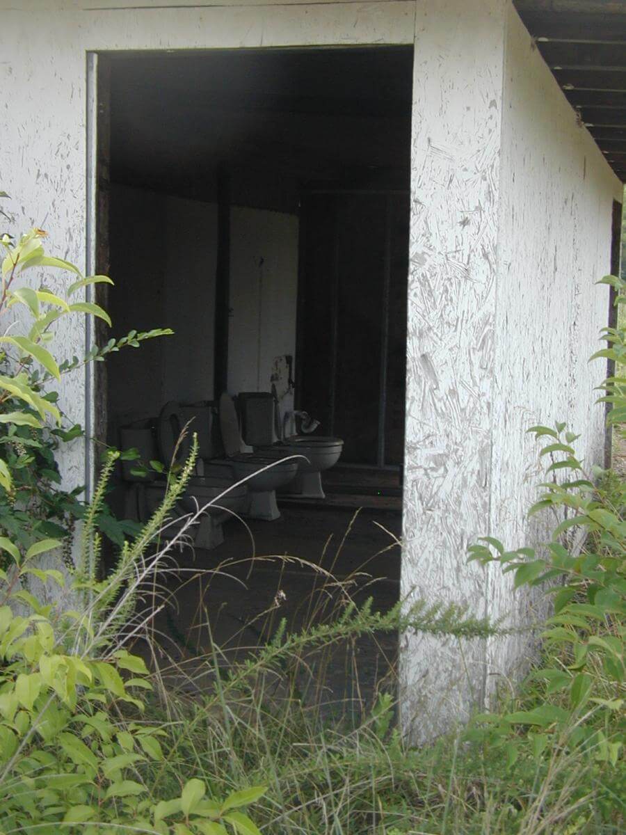 After nearly fifty years in operation, the Commerce Drive-In closed in 2001. Once, it sported three screens, but now only a few forlorn sections of plywood cling to the screen's skeletal wooden supports.36Gardner Linn, "Drive in, put it in park," The Red and Black [University of Georgia], 25 January 2001, Variety. http://www.redandblack.com/variety/drive-in-put-it-in-park/article_f83376cb-7993-520c-80ab-1110098fe456.html]. For a more detailed discussion of the layout of the Commerce Drive-In, see Lonnee, 107-115. Scrub grass and weeds cover the paved gravel lot. A few rusted speaker poles sprout here and there, but most are gone. The doors and windows of the concession stand yawn open. Inside, little remains except more peeling paint, collapsed ceiling tiles, and a row of three porcelain toilets.