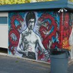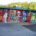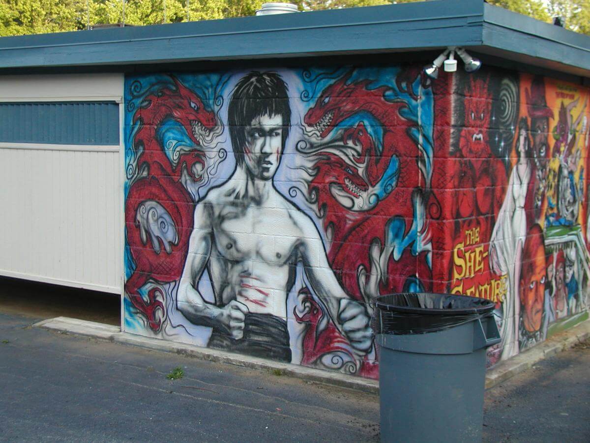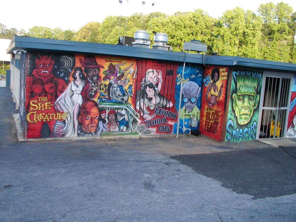 The Starlight was originally a single-screen theater when the Georgia Theater Company opened it in 1947. In 1956, the Georgia Theater Company added a second screen, and the drive-in's name was changed to the Starlight Twin to reflect the expansion. Another four screens were added in 1983, so that the Drive-in could compete with multiplexing indoor theaters.40Lonnee, 122-124. The Starlight Six property is divided into two large, asphalt lots, each with three screens, a snack bar, patio area, and separate projection booth. The three screens on the lower level have a greater capacity than the upper lot, and special events like the annual Drive Invasion, Rock and Roll Monster Bash, and Downhill Challenge are usually held there. The lower level’s snack bar features vivid murals of Bruce Lee, Rudy Ray Moore as Dolemite, Cheech and Chong, and Robby the Robot. Unlike most of the other drive-ins featured in this essay, there are no speakers and poles at the Starlight Six; audio is transmitted exclusively through patrons' FM radios.