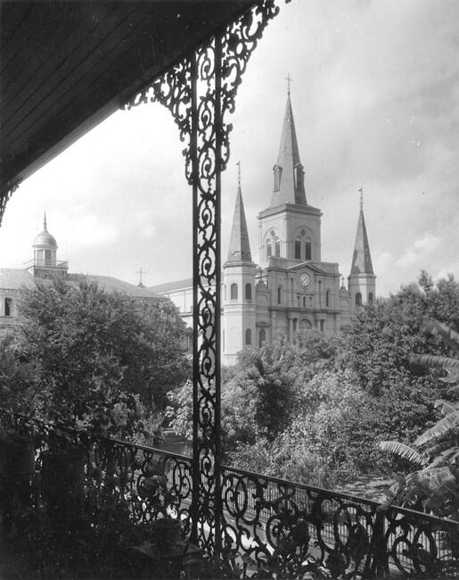 | St. Louis Cathedral, Seen from the Pontalba Apartments, from the WPA Guide to New Orleans. |