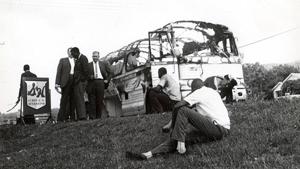 | Joseph Postiglione, Freedom Riders' bus after attack in Anniston, Alabama, 1961. Courtesy of Birmingham Civil Rights Institute. |