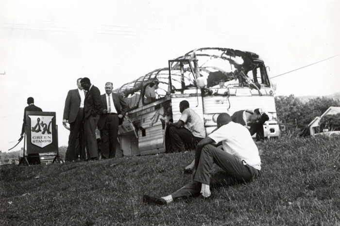 | Joseph Postiglione, Freedom Riders' bus after attack in Anniston, Alabama, 1961. Courtesy of Birmingham Civil Rights Institute. |