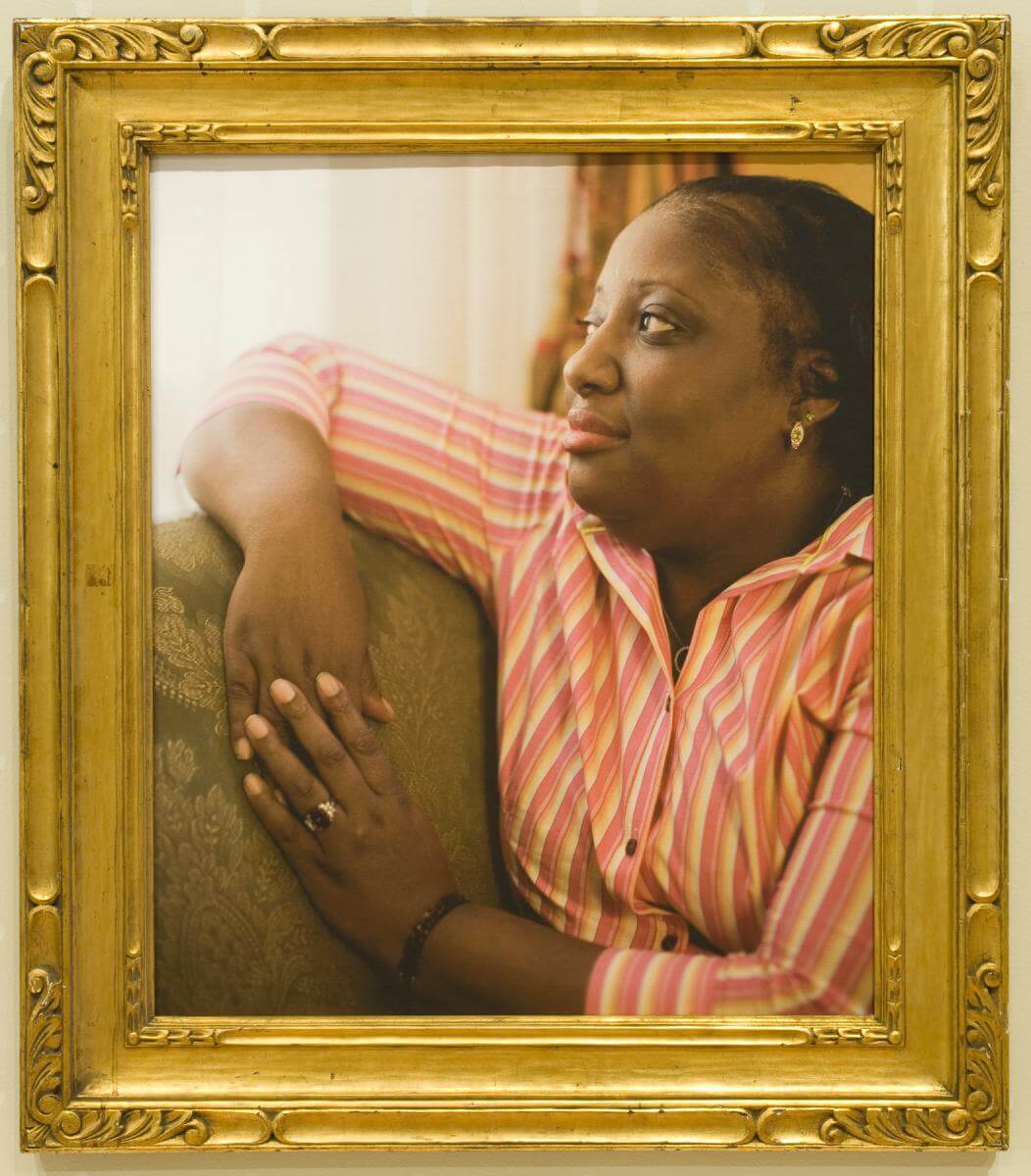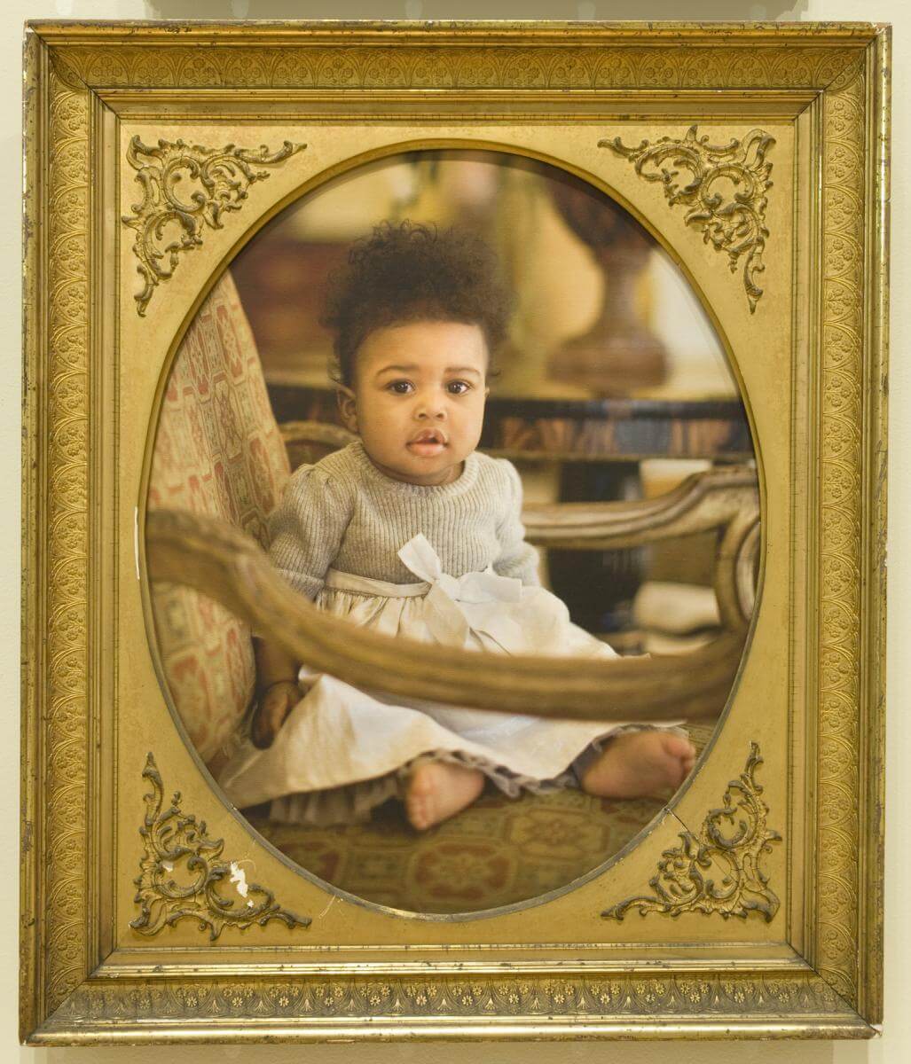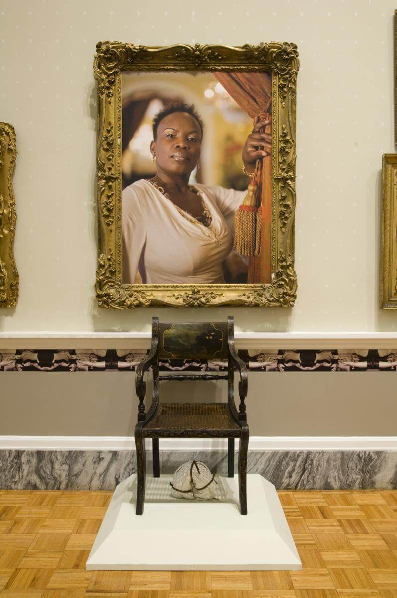 Elegantly photographed in elite settings, Page's large portraits, printed on canvas to reflect painted portraits in the installation, depict contemporary Charlestonians with the names of planter families. Recalling the complex interfamily ties that link whites and blacks in South Carolina, these images suggest how slaves were identified by the patronyms of their "owners," some of whom fathered and enslaved mixed-race children. The serious poses chosen by the subjects (without prompting by the artist) resemble those in historic portraits, suggesting the power of art and visual culture in shaping self-presentation.