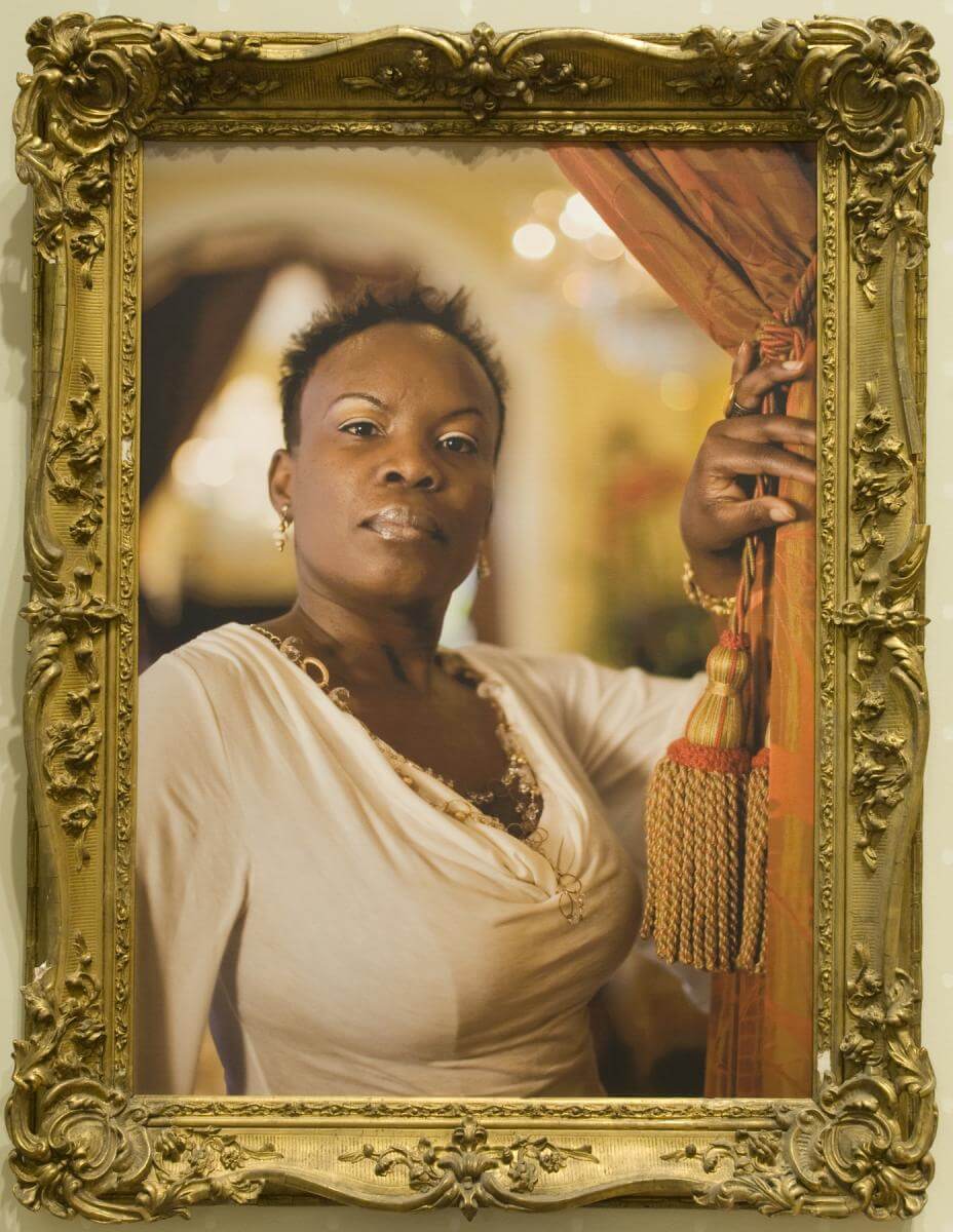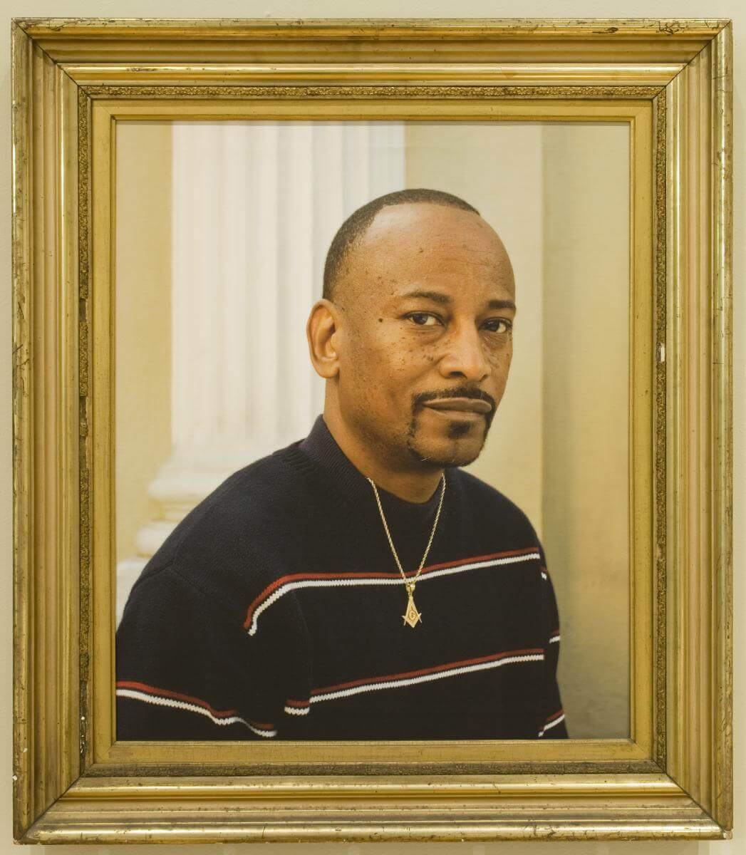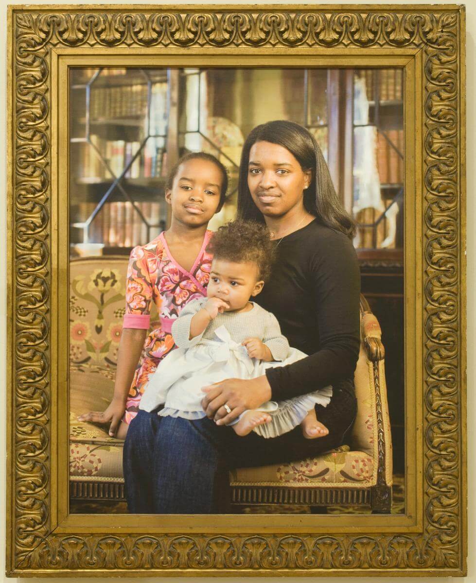 Elegantly photographed in elite settings, Page's large portraits, printed on canvas to reflect painted portraits in the installation, depict contemporary Charlestonians with the names of planter families. Recalling the complex interfamily ties that link whites and blacks in South Carolina, these images suggest how slaves were identified by the patronyms of their "owners," some of whom fathered and enslaved mixed-race children. The serious poses chosen by the subjects (without prompting by the artist) resemble those in historic portraits, suggesting the power of art and visual culture in shaping self-presentation.