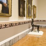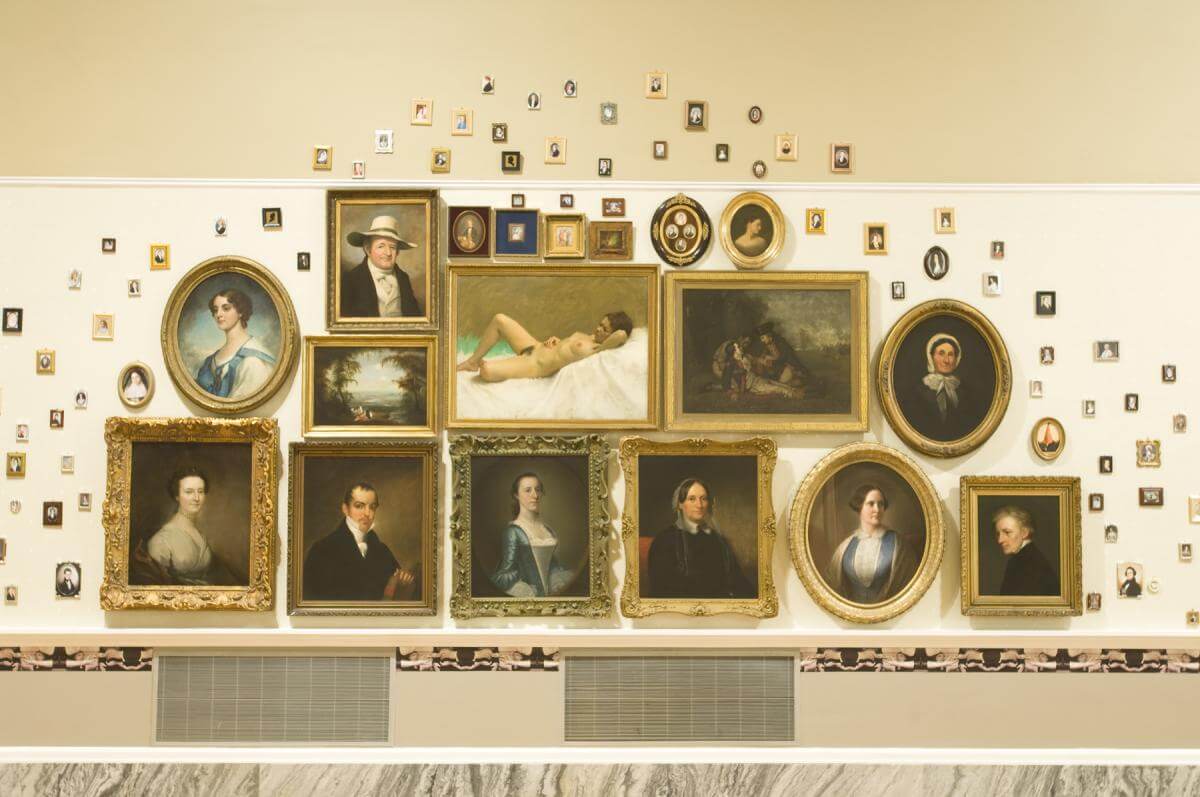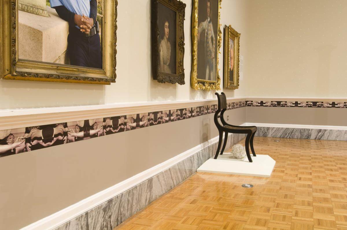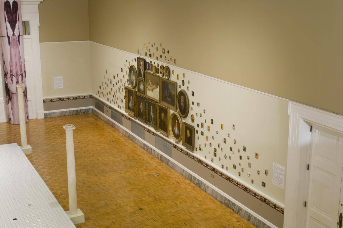 By arranging the overall grouping of paintings and miniatures to go beyond the limits of the picture rail, the artists transgress to criticize museum conventions. These conventions include those dictating who may or may not be pictured within such a cultural institution, so long dominated by a privileged few.