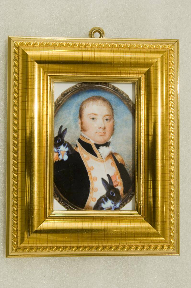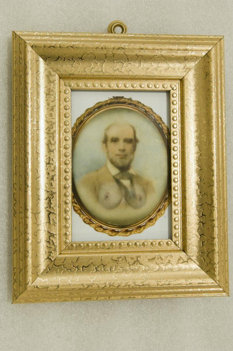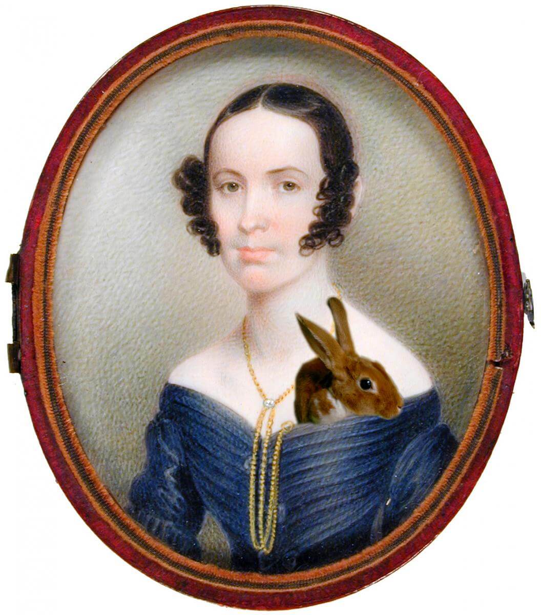 Alterations vary. In some cases they are used to question social codes that prevent display of non-normative sexuality. Responding to the rouge on a man's face or his carefully curled hair, for instance, Page may have added jewelry or further cosmetic touches to a portrait. Other miniatures gently poke fun at the repertory of poses typically used in portraits. One shows a brown and white rabbit peeking from a woman's bodice, while in another a man in Napoleonic-era clothing bears a rabbit on one shoulder as another rabbit leans over the frame as if to escape its limits.