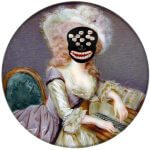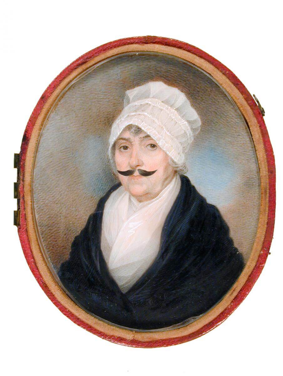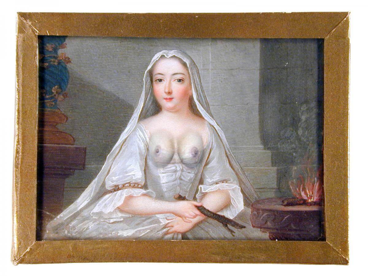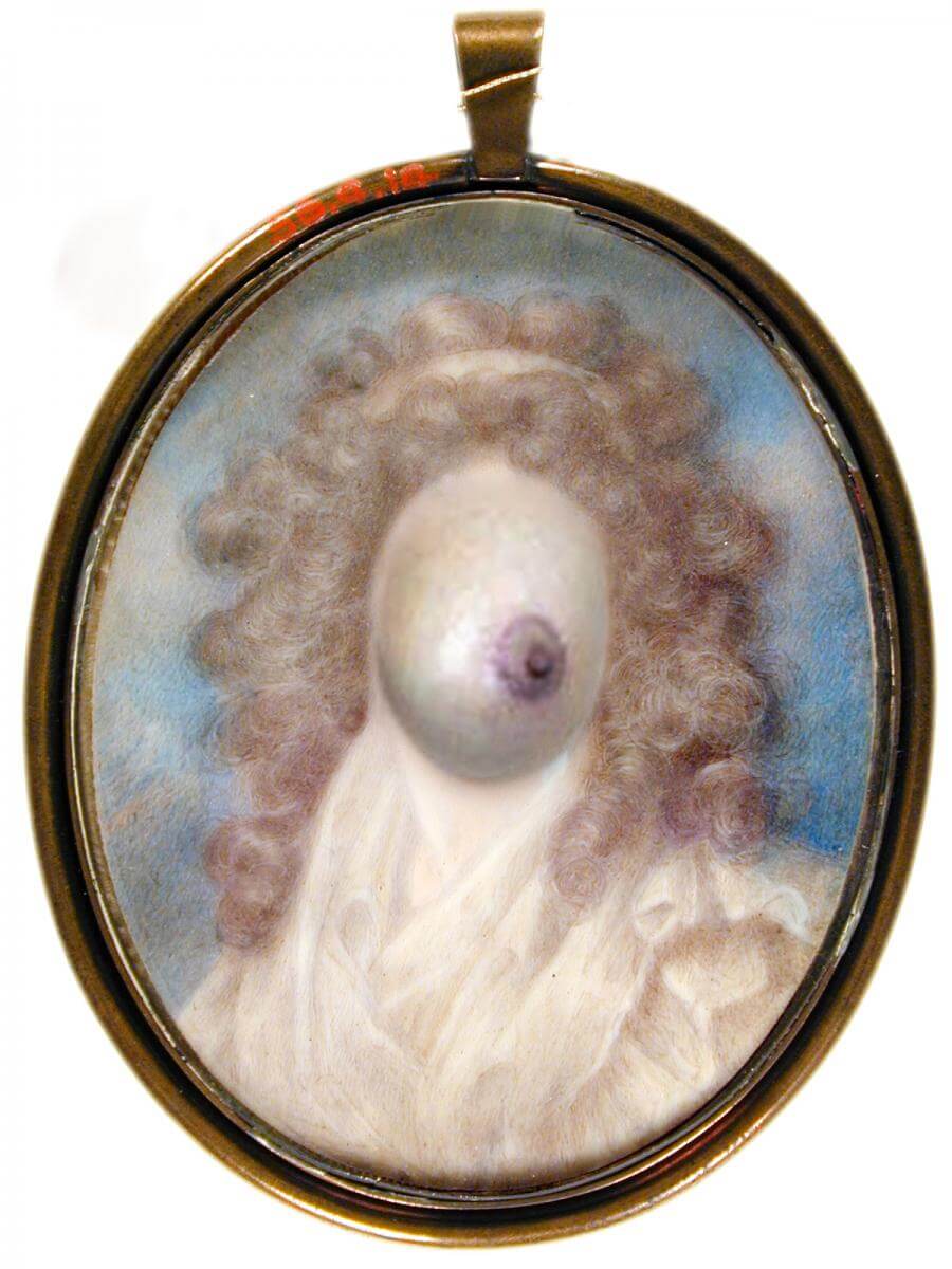 Alterations vary. In some cases they are used to question social codes that prevent display of non-normative sexuality. Responding to the rouge on a man's face or his carefully curled hair, for instance, Page may have added jewelry or further cosmetic touches to a portrait. Other miniatures gently poke fun at the repertory of poses typically used in portraits. One shows a brown and white rabbit peeking from a woman's bodice, while in another a man in Napoleonic-era clothing bears a rabbit on one shoulder as another rabbit leans over the frame as if to escape its limits.