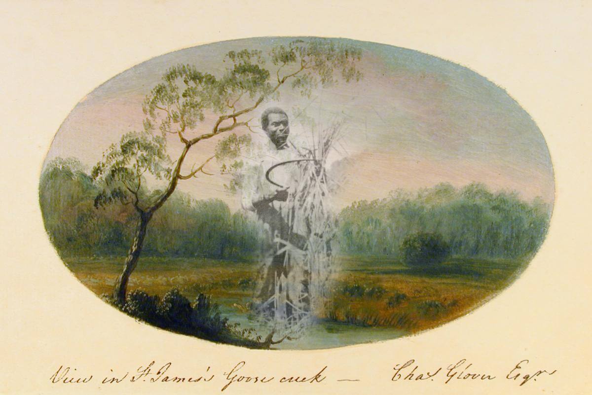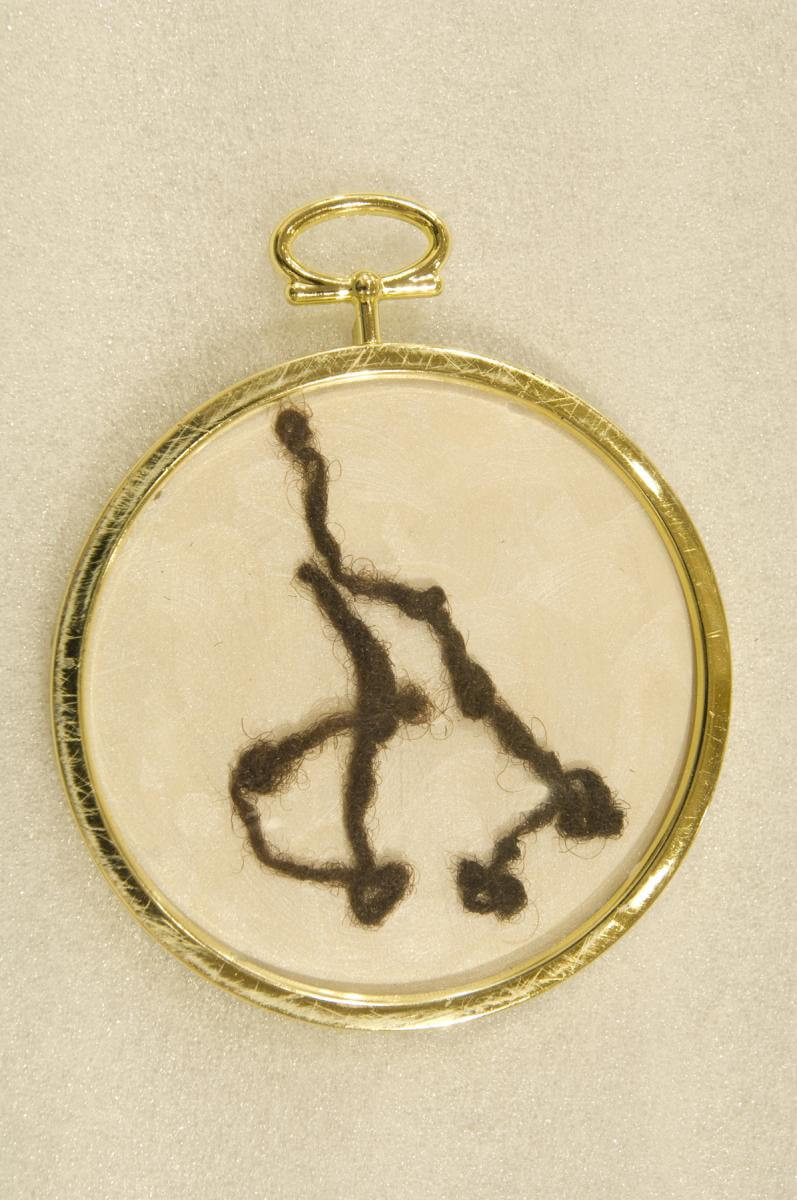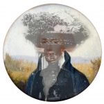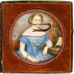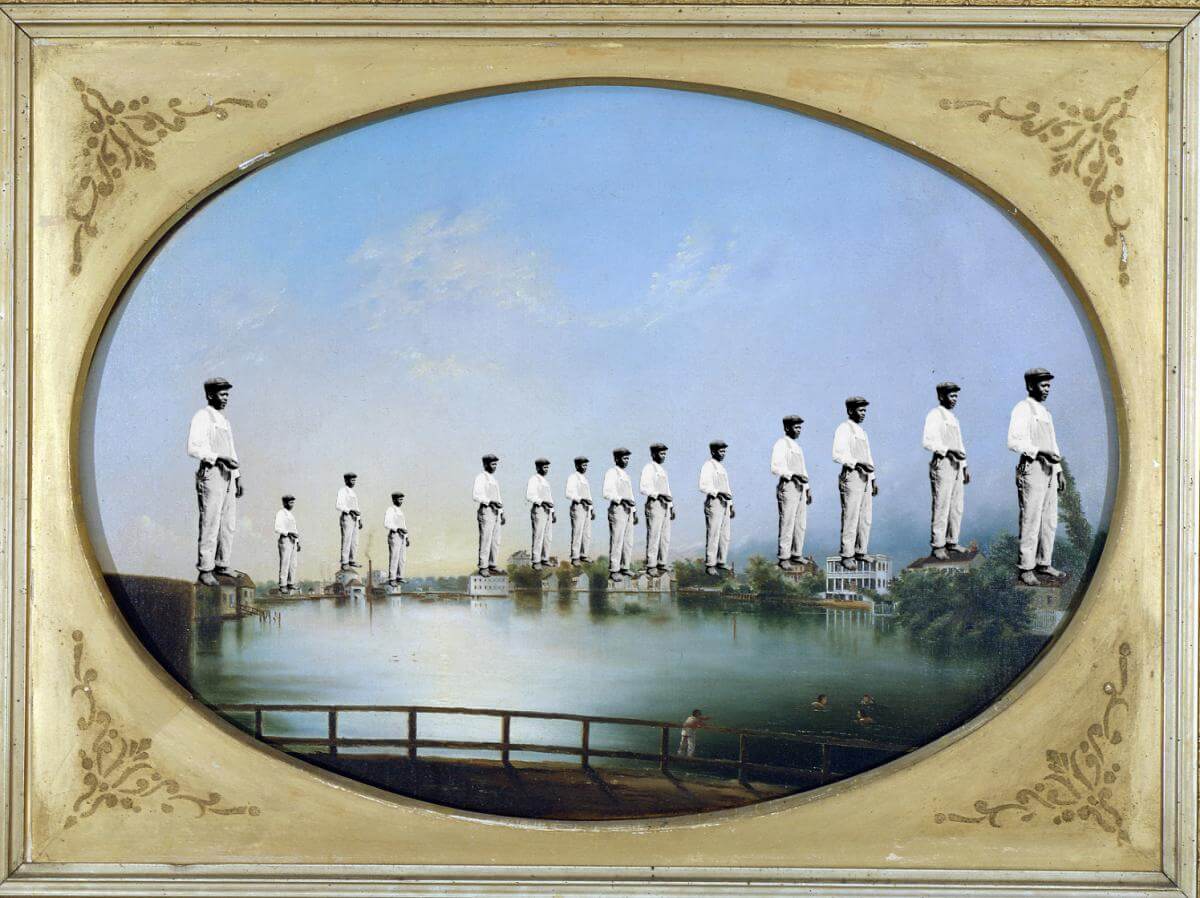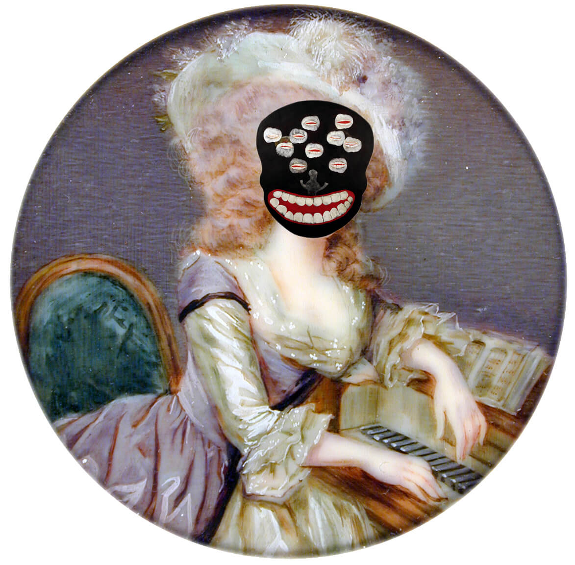 In other miniatures, images of slaves are overlaid on pastoral views of plantations or on cityscapes: reminders of the unacknowledged presence of the almost 2,500,000 slaves who lived and labored in the US South. These works reinscribe the presence of these slaves, so often omitted from representation. More controversially, topsy-turvy figures join the inverted torsos of planters and slaves, to suggest the necessity of the slave to the planter. Elsewhere, men and women have been painted in blackface, to reference minstrel shows that so disparaged African American culture. Women are also implicated. Elegantly dressed and coiffed, they may hold a leather whip or an iron slave collar. Or, in the case of one of Logan's alternations, they expose a toothy, savage grin, derived from caricatures of African Americans. Page and Logan placed Caucasian and African American hair together in some of the miniatures, referencing how these objects were treasured as keepsakes of a beloved other. The adding of hair from African Americans suggests the absence of blacks from the category of the treasured or even of the acknowledged.