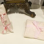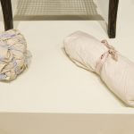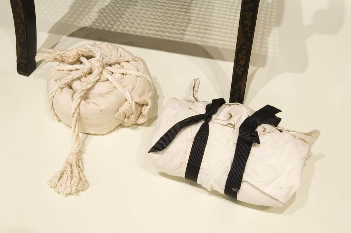 Eight variously shaped bundles, formed from Ku Klux Klan uniforms from 1920s South Carolina, make up Susan Harbage Page's Expressions of Affection. Attractive fabric strips and ribbons hold each bundle in shape, with the exception of one tied with an actual rope belt worn with Klan robes. The belt's resemblance to that worn by monks suggests how Klan members viewed themselves as a brotherhood with a mission or vocation. Ties made from pink silk fabric, seersucker, or pink and white ribbons implicate women in Klan activities: sewing hoods and gowns, as well as cleaning, pressing, storing, and treasuring them.