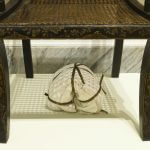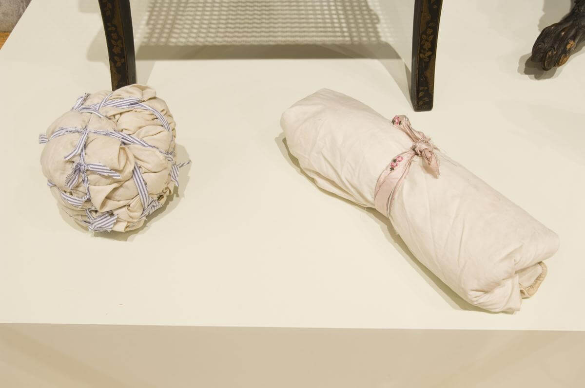 To tie such activities to the slave past and the plantocracy, Page presents the bundles on elegant period furniture: a table from the Charleston Museum and four matching chairs from the Joseph Manigault House. These luxurious objects once belonged to the family of Charles Pinckney, a wealthy Lowcountry planter and signer of the United States Constitution. Pinckney owned hundreds of slaves who worked on his numerous rice and indigo plantations, as well as at his Charleston home on Meeting Street. As a reminder that racism persists in many guises, even as it changes form, Page's installation links the slave past to the Jim Crow era and to the present. Provocatively, the attractive shapes of the bundles refer to decorative schemes extolled in magazines such as Southern Living or Martha Stewart Living. Displayed on platform risers painted in the color Lancaster Whitewash, the uniforms and furniture are propped up by whiteness in the literal and metaphorical senses.