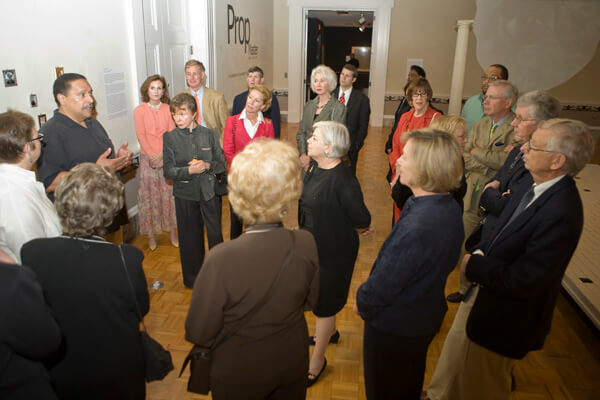 | Susan Harbage Page and Juan Logan, Page and Logan (far left) talk with museum visitors on Prop Master's opening night, Charleston, South Carolina, April 2009. Photo: Paul Cheney. |