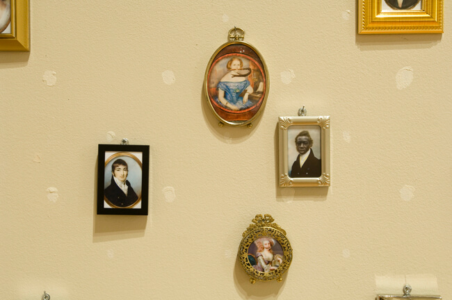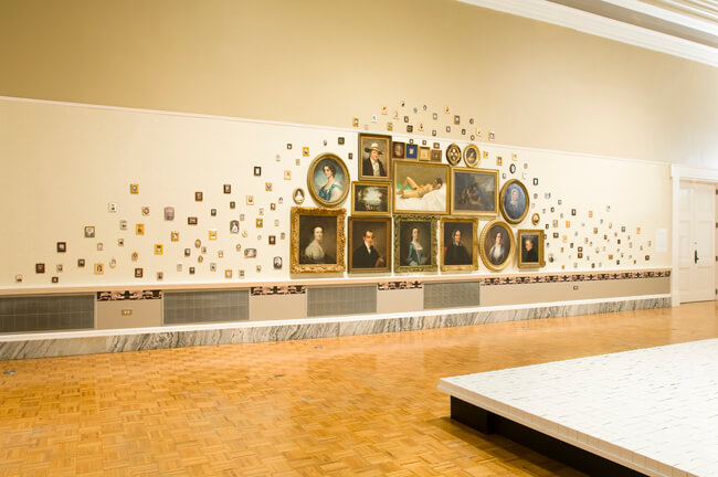 By arranging the overall grouping of paintings and miniatures to go beyond the limits of the picture rail, the artists transgress to criticize museum conventions. These conventions include those dictating who may or may not be pictured within such a cultural institution, so long dominated by a privileged few.