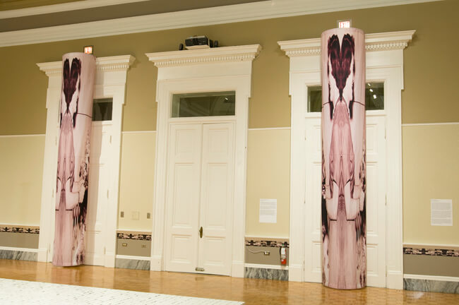 Susan Harbage Page's Background Material: Columns refer to the often unacknowledged but critical social function of privileged women. Framing the entrance to the exhibition, the pair of semi-circular, yet massive, fabric columns signifies how women prop up the social structure. Each column displays the digitally altered, archival photograph (from the Gibbes image archive of past museum openings) depicting a well-dressed, smiling woman serving cookies to a man. Doubled in mirrored reverse, she faces two directions as if to serve all sides at once. Stretched out of proportion, she becomes an abstraction. Her elongated form fits the pillars, which she graces as the upholder of social codes and rituals, and as decorative object and interior designer, suggesting her complicity in maintaining a rigidly divided society. One cannot identify the figure when close-up, due to the image's pixilation, but only from a distance. This suggests how difficult it can be to understand one's culture when immersed within it.