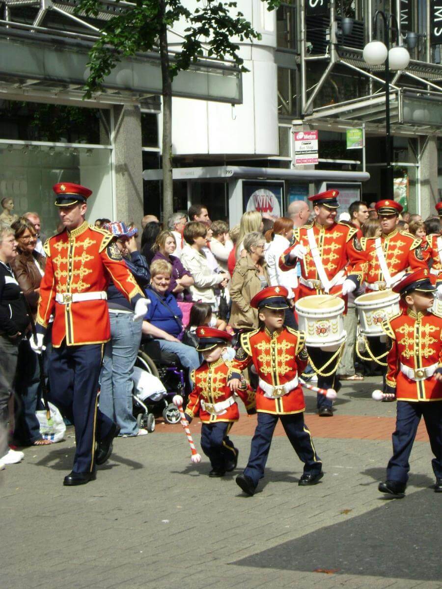 We were in for a dramatic change when we arrived in Belfast for the July 12 Orange Order parades celebrating the 1688 Protestant victory of King William of Orange at the Battle of the Boyne. During "the Troubles", these parades marched aggressively through Catholic neighborhoods, trailing violence and destruction. After the Good Friday Agreement of 1998, the neighborhoods became out of bounds to the parades. Still, the visual celebration of Protestantism, identification with British culture, and denigration of the Republic of Ireland publicly antagonized Catholics. Menacing bonfires included burning of Irish flags and led to fights between Catholics and Protestants. The martial demeanor of the marchers made us uneasy. Continuing bitterness is not far from the surface. One man carried a sign, initials only — KAI. A Northern Ireland student told us that meant "Kill All Irish."