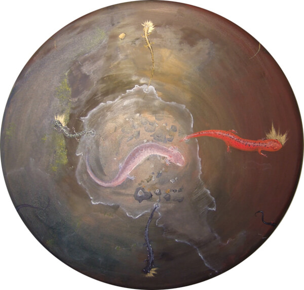 Nevertheless, I find this idea of salamander origins in the Appalachians a powerful metaphor for origins of life. There are points of origin. Each branching on the tree is a point of origin and the beginning of a new line in the story. If we could trace all our origins all the way back, we would find that we salamanders, we hominids, we birds, we slime molds and mosses all came from one placeāout of the water and out of the earth. The habitat of most salamanders is the moist earth, the kind of dark place that is recycled from death, yet lush with life. For me an image that bores into the center of the earth, to our origins, is equally sacred as one that opens up into heaven. Thus I have strived to honor this origin story with an earthy mandala.