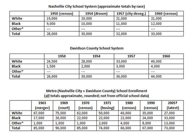1963: Nashville and Davidson County governments merge, creating one political jurisdiction of 400,000 people (83% white, 17% black) and one unified (though still largely segregated) school system with about 85,000 students (79% white, 22% black, 1% "other").