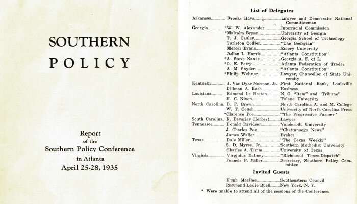 | Title page and list of delegates from Southern Policy Committee's Report of the Southern Policy Conference Atlanta, Georgia, 25-28 April 1935. |