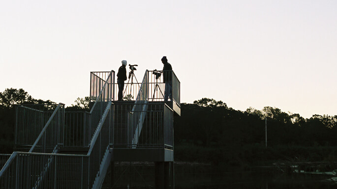 Revisiting Flaherty's sites and subjects was also a physical journey, a set of embodied performances that allowed us to re-experience the region, and in some ways what our project documented is less the cultural and natural environment than it is our direct experience of it. One November morning, I found myself standing in a swamp on Avery Island, clutching a bag of batteries, wondering if we had sufficiently planned distribution of our video equipment for the late morning when our three vehicles would take off in three separate directions to interview various subjects. Another day, I found myself sweating in J. C. Boudreaux's FEMA trailer, the air conditioning turned off since it had been interfering with our audio recording, watching my laptop play back his young self waving at us from atop the "Christmas tree" that capped off the oil well in the final scene of Louisiana Story. Boudreaux was pleased to revisit the film with us that day. His only copy had been lost in the hurricane.