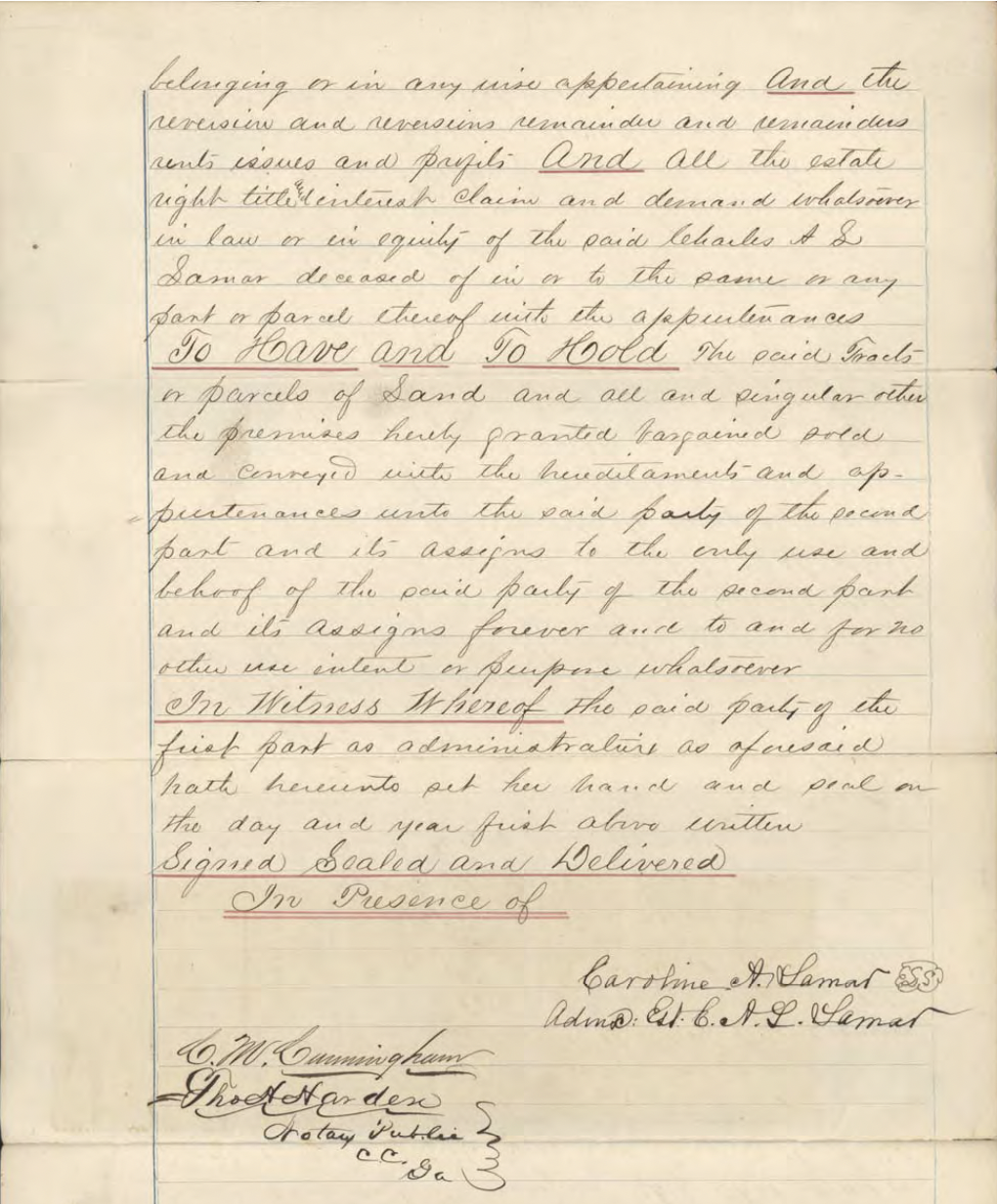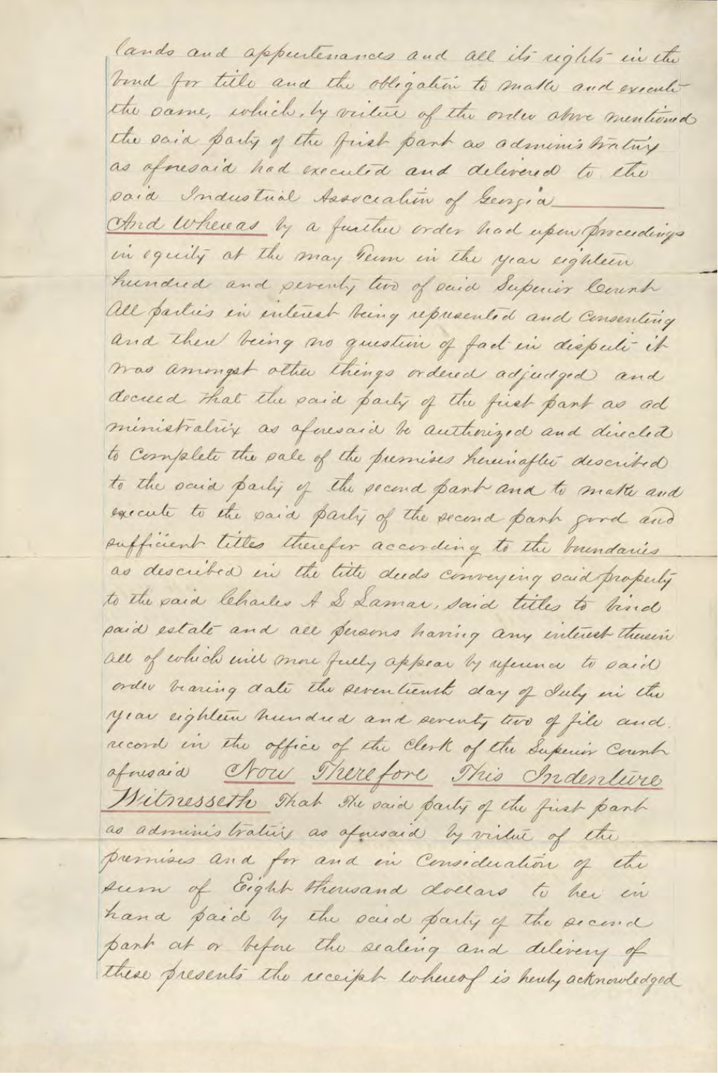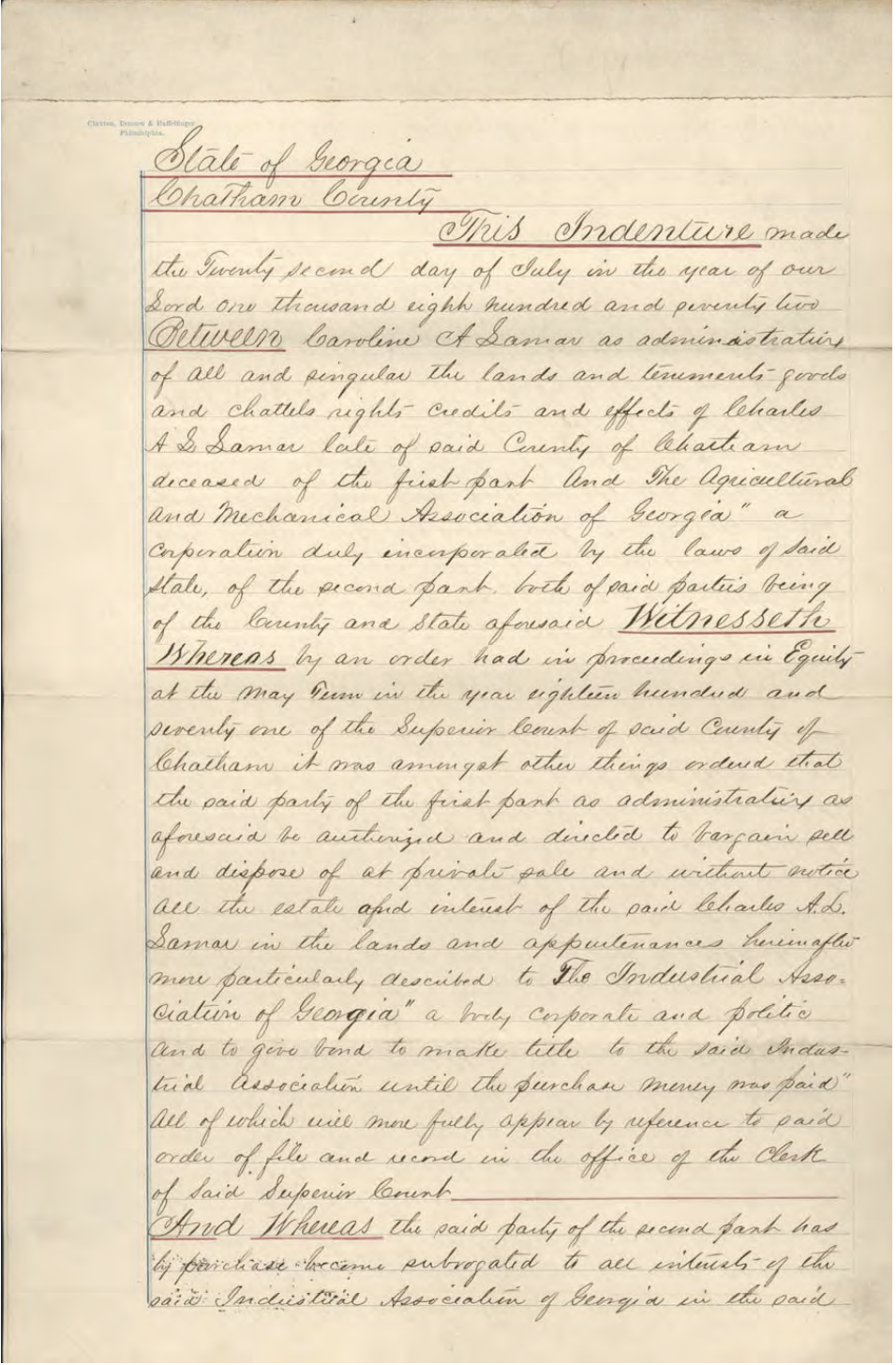 At the GHS, I also searched for "Charles Lamar," and "Ten Broeck," trying to find what, if any, connection Lamar had to the Weeping Time. I discovered a deed, dated 1872, for the sale of the racecourse lands, sold by Mrs. Caroline Lamar, "widow and executrix of C. A. L. Lamar," to the Agricultural and Mechanical Association of Georgia. The Association utilized the Ten Broeck Race Course site for agricultural fairs and allowed the continuation of horse racing there. The deed below shows the four pages from the deed of sale, which indicates that Charles Lamar acquired the property "known as the Race Track" from Ebenezer Jencks according to a deed dated January 31, 1857. This earlier deed strongly suggests that Charles Lamar may have had something to do with the renaming of the site as the Ten Broeck Race Course, since prior to his purchase it was known as "Oglethorpe's Race Track," "Jencks' Old Track" or simply the "Race Track." An advertisement in The Savannah Republican on January 4, 1857, refers to races at the "Ten Broeck course," and this, prior to the inaugural Ten Broeck race, mentioned in the newsmagazine Spirit of The Times as having occurred on January 7, 1857. It is plausible that Lamar was involved in the plans and actions to acquire, reconstitute and name the race track site prior to the inaugural race, and the recording of his purchase of the race course on January 31, 1857.62Specifically, Caroline Lamar sold 62 6/10 acres adjacent to Louisville Road, and an additional forty-five acres south of Augusta Road, and north of "Oglethorpe's Race Track," to the Association, for eight thousand dollars.