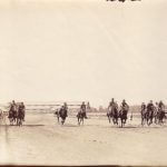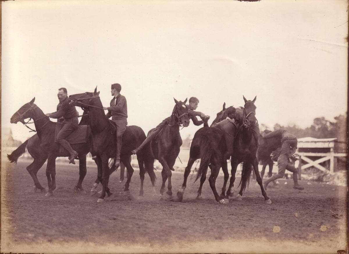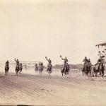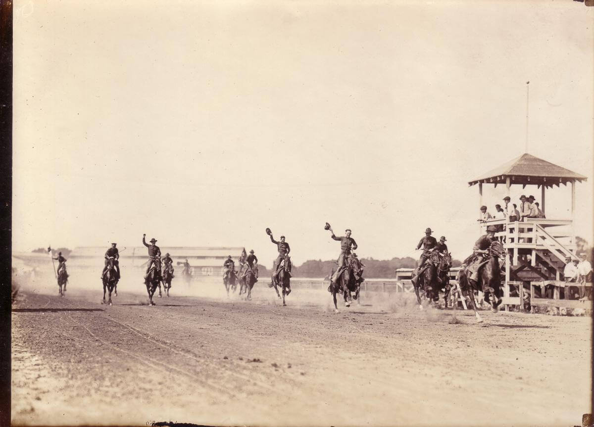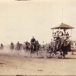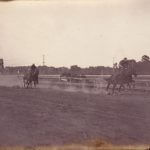 The palimpsest of near-faded and faint dashed lines amid bold city lines and plots excoriated in grid form show in this map alone, the nearly 140 years of Euro- and African-American settlement. Old trails, possibly used by American Indians, became the roads of colonial Americans; Augusta Avenue appears on very early Savannah maps as a trail. Images of several Savannah Jockey Club members from the 1890s, obtained from GHS, show the racetrack and structures: a covered grandstand to one side of the track, shed-like buildings on one side of the "turns" in the track, and smaller (likely timekeeper's) raised platforms. The 1872 Platen map shows two rectangular structures adjacent to the straight stretch of the racetrack, on the north side. These structures are most likely a seating grandstand and covered stables. Doesticks writes that prior to the slave sale, for four days while under inspection by buyers, and for two days during the actual sale, the enslaved were kept in sheds typically used for the horses. He mentions that the slave sale, however, took place in the grandstand:60Doesticks, "Great Auction," 14; for other details of the sale, see also Bell, and Berry, "'We'm Fus' Rate Bargain.'"