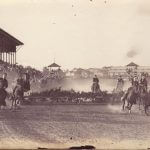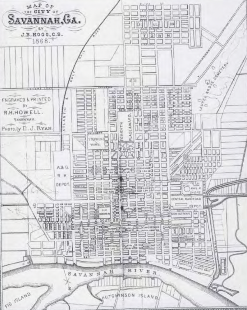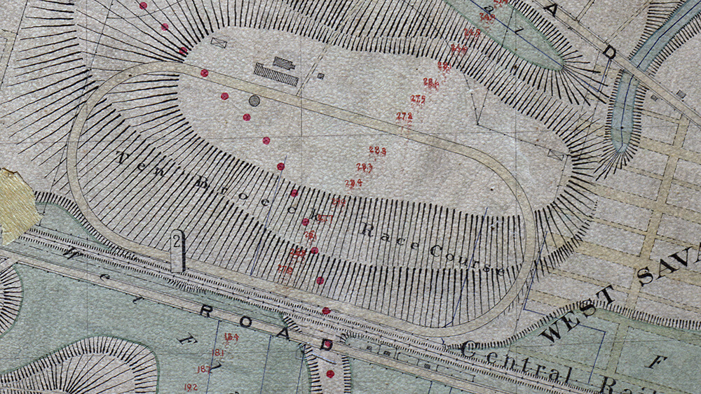 Earlier eighteenth-century maps clearly indicated that these were "Indian lands." The area that was to become the Ten Broeck Race Course is not in the image, but is further to the west in the area shown (by dots) as vegetated. Fifty years later, Savannah's growth and prosperity is evident in J.B. Hogg's 1868 map, which shows the city's expanded boundaries in 1868. The racecourse location is not captured in this map. At the west side of the city (north is to the bottom of the page), the words: "CENTRAL RAILROAD DEPOT" are evident adjacent to the intersection of Liberty and West Broad Streets; and the rail tracks are visible heading west toward Macon, their immediate destination. The racecourse would be located an equal distance west from the edge of the image as the depot is to the east, situated along the Central of Georgia lines.