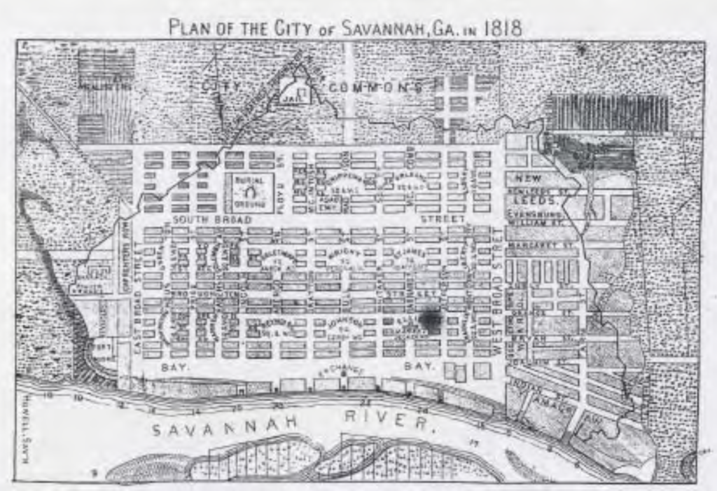 In the 1818 plan of Savannah with the squares James Oglethorpe laid out, Johnson Square (where slave dealer Joseph Bryan would one day have his slave pen and office) is faintly discernible just south of the Savannah River and the "Exchange" (north is to the bottom of the page, and west is at the reader's right hand). To the west of 'West Broad Street,' and not too far from the Savannah River and 'Indian Street' on this map, is a label for 'Bryan Street,' named after an earlier (related) Joseph Bryan, "benevolent friend of [James] Oglethorpe, who came [from South Carolina] with four of his sawyers in 1733 and gave their labor free for two months."51Gamble, "A History of the Municipal Government of Savannah from 1790 to 1901," 38.