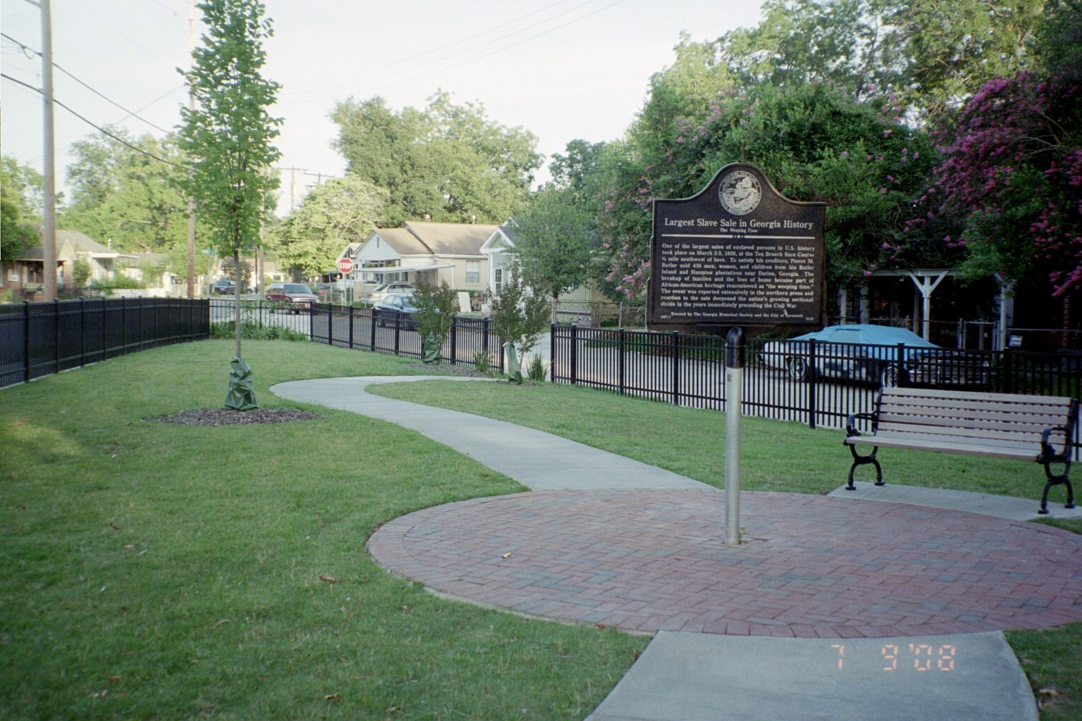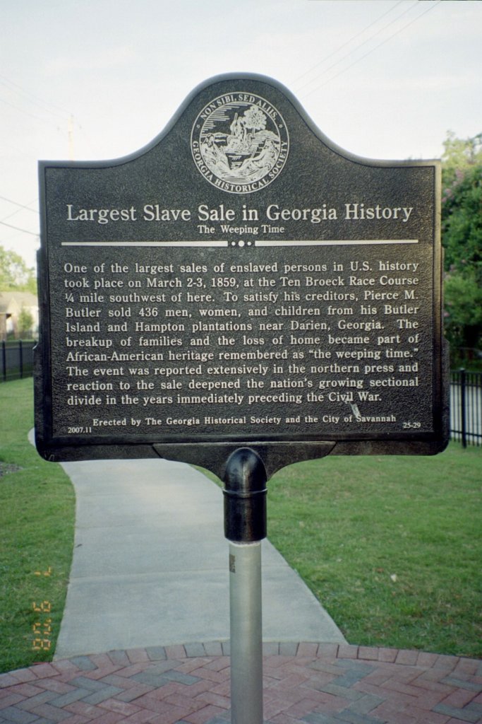 Because of the size of this sale, its effects upon those who were sold and their descendants, and the extent to which it inflamed the tensions leading to the Civil War, the Ten Broeck Race Course is an important cultural landscape and a place of heartbreak.4Keith H. Basso, Wisdom Sits in Places: Landscape and Language among the Western Apache (Albuquerque: University of New Mexico Press, 1996). Yet it was not until 2008 that the city of Savannah and the Georgia Historical Society placed a marker near the site of the sale.5The precise sale site is a quarter mile away, and not visible, from the commemorative marker. The significance of the Weeping Time sale and how the Ten Broeck Race Course came to be marked is the subject of this essay.