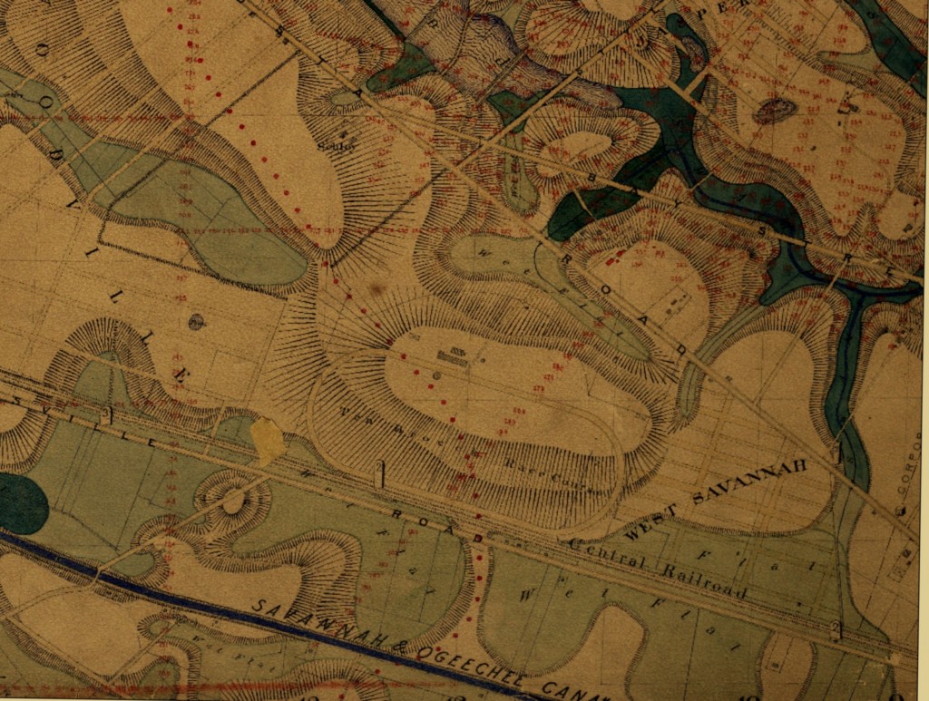 I was surprised that people I queried in Savannah knew nothing about the Ten Broeck sale. I searched archives for period maps of Savannah and Chatham County, examined written documents that might refer to the race course site or to events that took place there, and traveled in search of the site. I studied maps, images, histories and news articles of Savannah produced from 1734 through the present, but concentrated my focus on the period 1845 through 1875. Since at least three written sources indicated that the Ten Broeck Race Course was "three miles" west of Savannah on the Central of Georgia Railroad, my hope was to find maps that would show enough land area in enough detail to allow identification.49Doesticks, "Great Auction"; Bell, Major Butler's Legacy, 329; Fraser, Savannah in the Old South, 310.