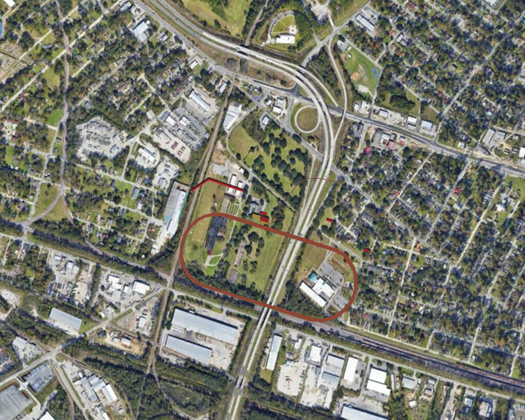 To depict the actual site of the sale, I worked with GIS specialist Michael Page, Geospatial Librarian, of Emory University, and Kyle Thayer, Emory graduate student in Computer Science, to create a composite map and attendant 3-D images at the culmination of this research project, using the aerial photographic software Google Earth, the computer-aided design software AutoCAD, and a three-dimensional design software, Lightwave. Initially, a racecourse meeting the specifications of Ten Broeck was drawn using AutoCAD. Track width and all pertinent dimensions, including the location of the finish line, were obtained with assistance from the Keeneland Equestrian Library in Lexington, Kentucky, and from Belmont Park, home of the New York Racing Association in Elmont, New York. The computer-generated racetrack, with attendant grandstand, was imported into a mapped contemporary image of the site area of the former racecourse. Ultimately, our composite map was created from interrogating and analyzing a historic plat of the Ten Broeck racecourse site, historic maps of Savannah and Chatham county, 1890s photographs of the Savannah Jockey Club members at the Ten Broeck Race Course, and a contemporary aerial photograph of the site.