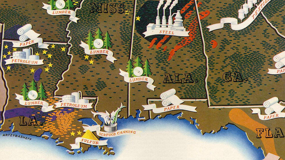 "No. 1 economic problem" but as the nation's "No. 1 economic opportunity" for industrialists. With abundant natural and human resources, the South was ripe for development, the article advised American investors. In mining, timber, textiles, cotton spinning, hosiery production, cigars, and canneries, the New South, from the Chesapeake to the Gulf of Mexico, had vast potential, Fortune readers were told; low labor and energy costs, low taxes, and low levels of unionization all meant high returns on every dollar of investment. A colorful map oriented readers to the region's diversity and promise.28"The Industrial South," Fortune Magazine, November 18, 1938, 44–55.