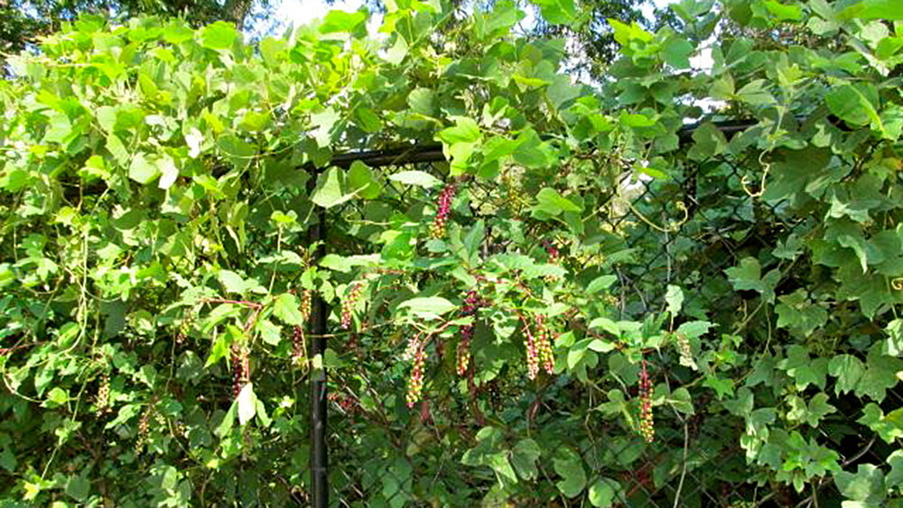 So growls Tony Joe White in his 1969 hit, "Polk Salad Annie," about a notorious woman and a ubiquitous weed. Pokeweed, or poke sallet ("salad"), grows natively with astonishing vigor across the American South. Despite what Tony Joe suggests, however, pokeweed is not an exclusively rural species, in "the woods and the fields." These dark red stalks with their smooth, flat, succulent green leaves thrive in urban and suburban backyards, along roadsides and through cracks in grocery store parking lots. At the height of their growth in late summer, pokeweed stalks bow over from about eight feet, weighted down by loads of berries that ripen from green to deep purple.