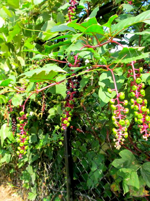 So growls Tony Joe White in his 1969 hit, "Polk Salad Annie," about a notorious woman and a ubiquitous weed. Pokeweed, or poke sallet ("salad"), grows natively with astonishing vigor across the American South. Despite what Tony Joe suggests, however, pokeweed is not an exclusively rural species, in "the woods and the fields." These dark red stalks with their smooth, flat, succulent green leaves thrive in urban and suburban backyards, along roadsides and through cracks in grocery store parking lots. At the height of their growth in late summer, pokeweed stalks bow over from about eight feet, weighted down by loads of berries that ripen from green to deep purple.