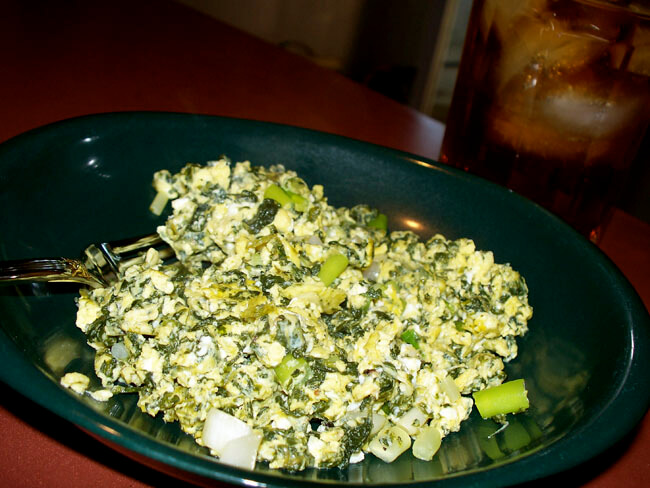 Mee-Ma would have answered that there was nothing that bacon grease couldn’t make taste good. So I melted a generous tablespoon of it in a skillet and let the slimy poke slide in along with some spring onions. As it started to sizzle I added a couple of lightly beaten eggs and some salt and pepper. I cooked them down until the eggs were dry.
