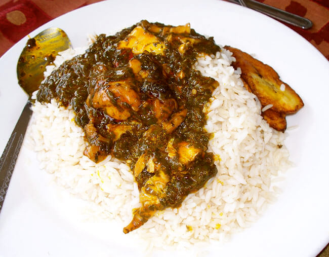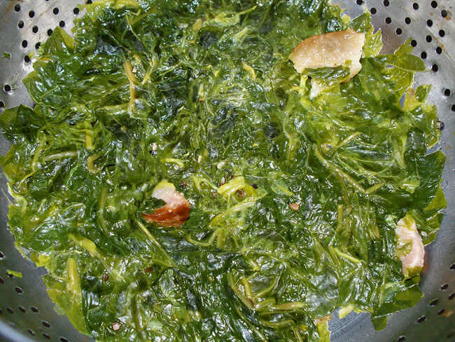 After the last boiling, I noted that the greens were beginning to resemble a traditional palava dish of okra leaves that I had eaten in Liberia a few years ago, which had been delicious, so how bad could this be?