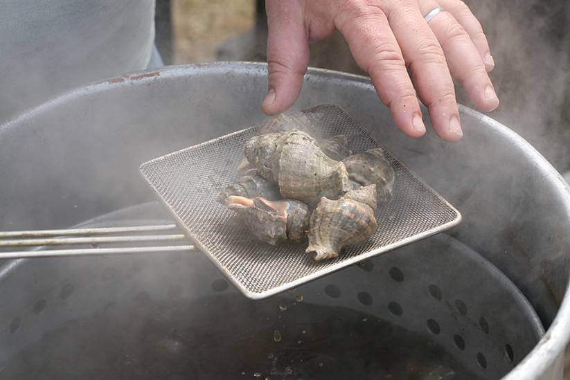 Ribbonfish, Almaco Jack, Big Eyes, Rainbow Runners, and Drills. Oysters were not the only food to regain their names at the Foodways Texas Gulf Coast gathering. A panel took on monocultural fishing practices driven by market forces, practices that value one product and dismiss everything else that comes up in the nets or on the line as “trash.” If Redfish are selling, then Ribbonfish get trashed, along with Rainbow Runners. But if we rename the trash as by-catch, and find someone like P. J. Stoops, a walking encyclopedia of the names and qualities of Gulf species, then we might compare the Almaco Jack with the Big Eyes and not throw either away. By restoring the names and the balance, we also might find similarities between predators such as oyster drills and delicacies such as escargot, and discover that devotees of snails in butter and delicate herbs also may like oyster drills—kissing cousins to the land snails—prepared the same way. Such practices could help protect the oyster beds from at least one threat.