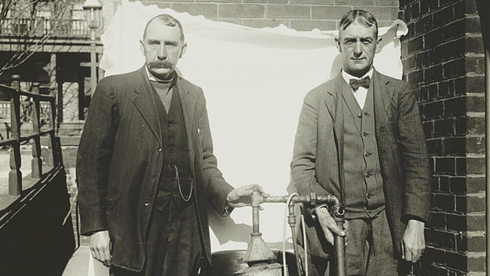 | Hosea Thomas' still workers in Endicott, (Franklin County) Virginia, 1915. The Martin, Rake, and Thomas families trace their origins to Ireland where local residents learned to make liquor (known in Ireland as "potchin") to supplement farm income. Photo courtesy of the Blue Ridge Institute of Ferrum College. |