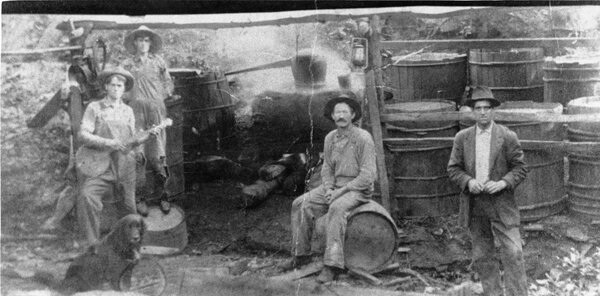 | Hosea Thomas' still workers in Endicott, (Franklin County) Virginia, 1915. The Martin, Rake, and Thomas families trace their origins to Ireland where local residents learned to make liquor (known in Ireland as "potchin") to supplement farm income. Photo courtesy of the Blue Ridge Institute of Ferrum College. |