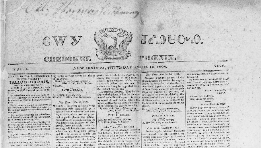 | Cherokee Phoenix, New Echota, Georgia, April 10, 1828, Library of Congress, 97512373. Text from "Atrocious Injustice," May 18, 1833, is available from the Sequoyah Research Center. |