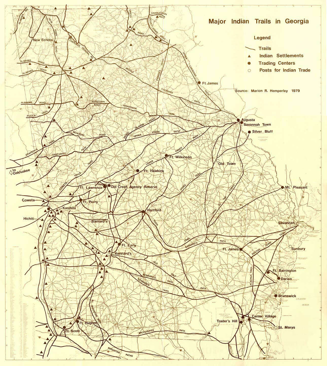 | Marion R. Hemperly, Map of Indian trails in Georgia before removal, Office of Indian Heritage, 1979. |