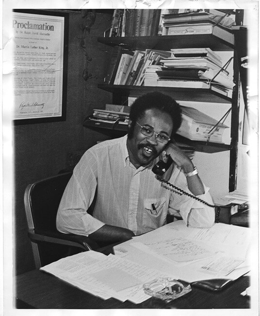 | Elaine Tomlin, Fred Taylor at his desk at SCLC, circa 1970s. Courtesy of SCLC records, MARBL, Emory University. |