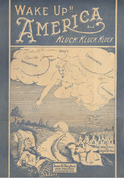 Cover of Walter B. Seale and Adger M. Pace's "Wake Up!! America and Kluck, Kluck, Kluck," an explicitly racist song published by James Vaughn's songbook company in 1924.