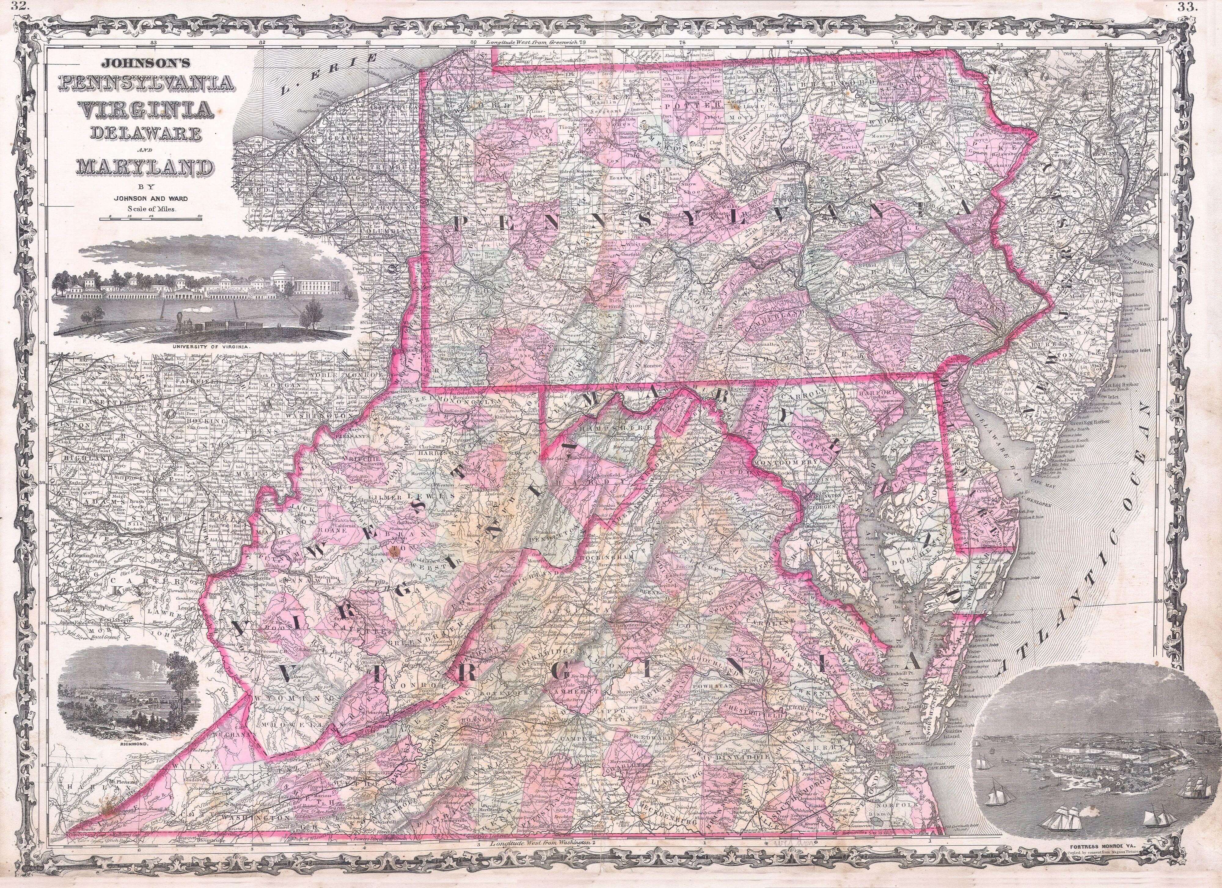 | Alvin Jewett Johnson, "Johnson's Map of Pennsylvania, Virginia, Delaware and Maryland, 1863," from Johnson's New Illustrated (Steel Plate) Family Atlas with Descriptions, Geographical, Statistical, and Historical (New York: Johnson and Ward, 1863). |