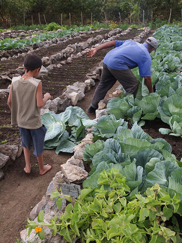 The garden at Primero de Mayo grows eight kinds of vegetables with seeds supplied by the state. Ten members share the proceeds of the produce sold in the streets. The vice-president of the cooperative garden, Pedro Rodriguez Pérez, explained that while the government supplied the land and seeds, the more the members sell, the more they make. The cooperative pays a percentage back to the government, but there is incentive in reaching more customers. The model is not yet generating enough income to allow farm families to have economic autonomy from state subsidies (the same is true of US farmers). Even so, I appreciated watching a grandfather and grandson working side-by-side on land over which they had some say. The tradition of acquiring agricultural knowledge via parent or grandparent remains alive in Cuba in a way that it does not in most parts of the United States. This is largely because of efforts by organizations of small farmers between the Revolution and the Special Period.18Funes, "The Organic Farming Movement in Cuba," 5.